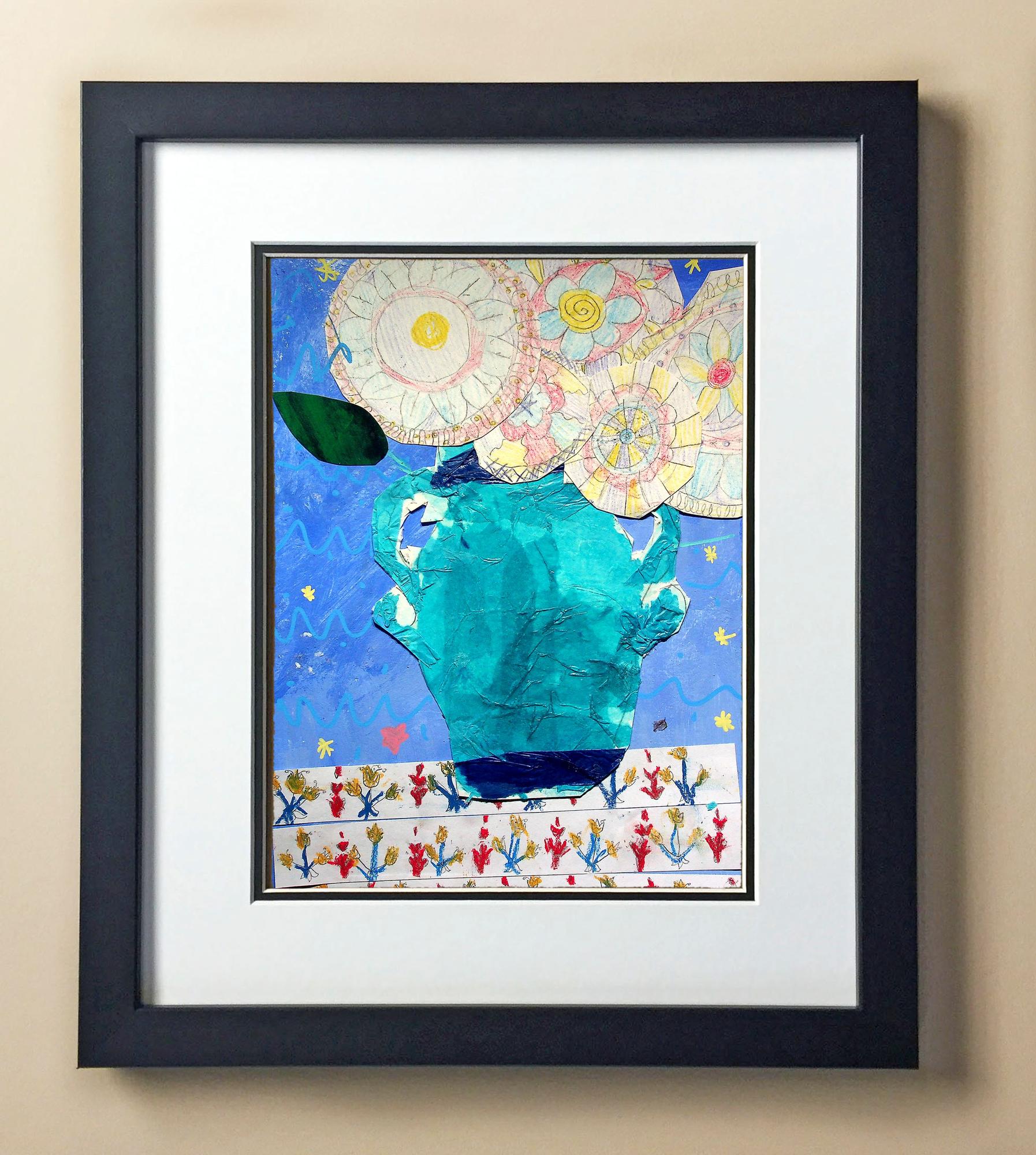 Included with the purchase is the Students Artwork, Frame, double matboard, shatter proof plexiglass, and a ready to hang backerboard with turnbuttons