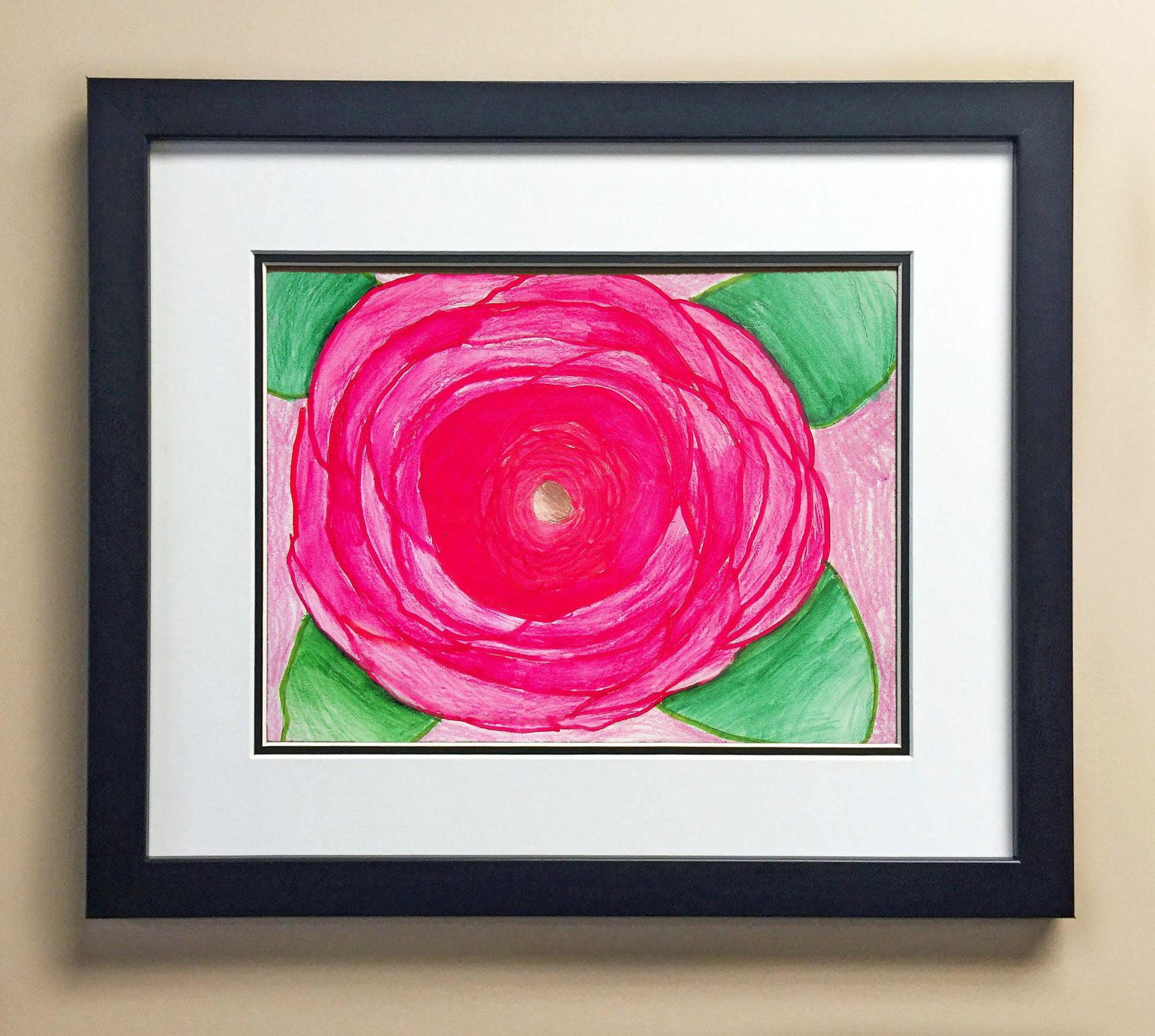 Included with the purchase is the Students Artwork, Frame, double matboard, shatter proof plexiglass, and a ready to hang backerboard with turnbuttons
