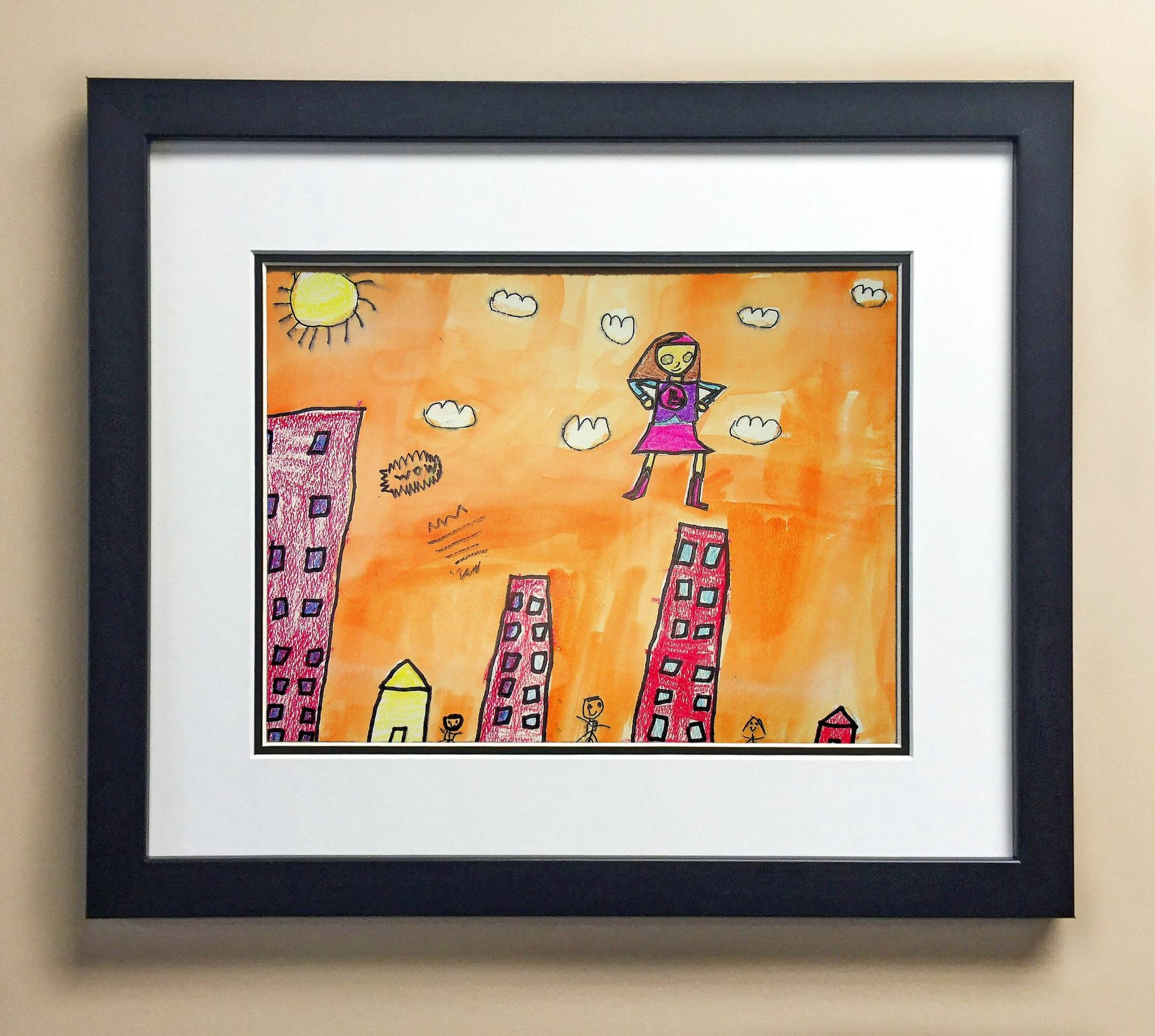 Included with the purchase is the Students Artwork, Frame, double matboard, shatter proof plexiglass, and a ready to hang backerboard with turnbuttons