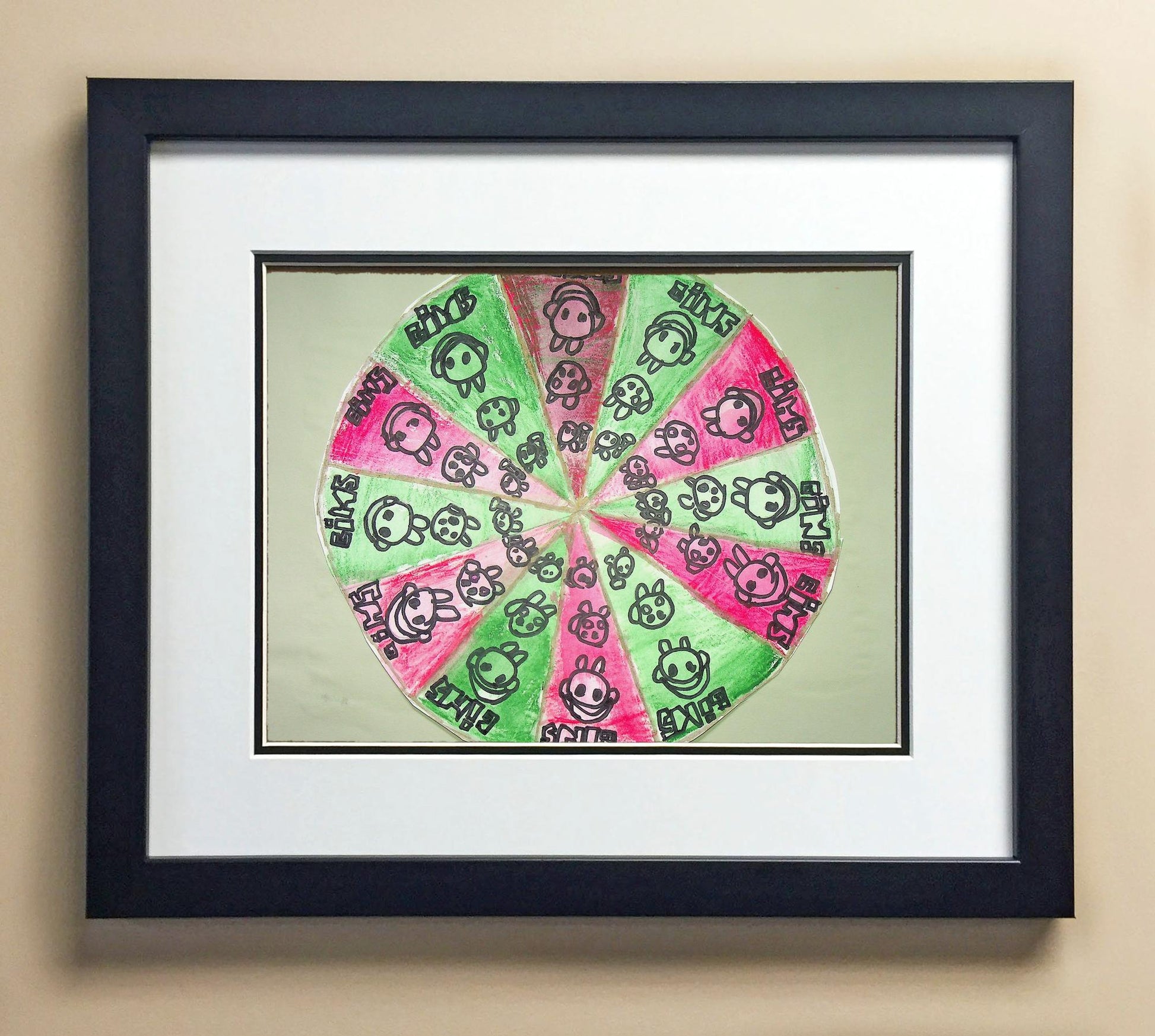 Included with the purchase is the Students Artwork, Frame, double matboard, shatter proof plexiglass, and a ready to hang backerboard with turnbuttons