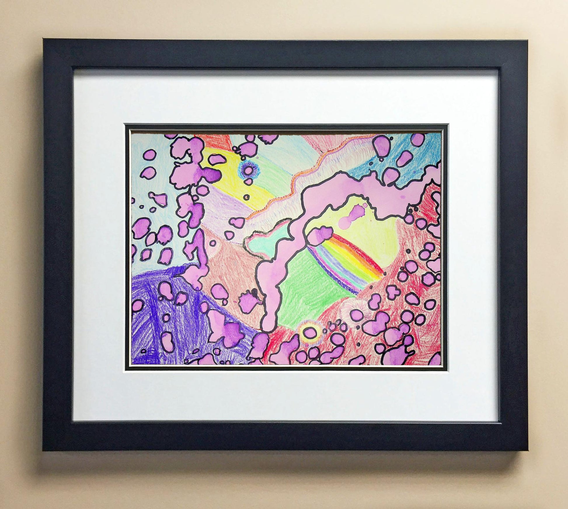 Included with the purchase is the Students Artwork, Frame, double matboard, shatter proof plexiglass, and a ready to hang backerboard with turnbuttons
