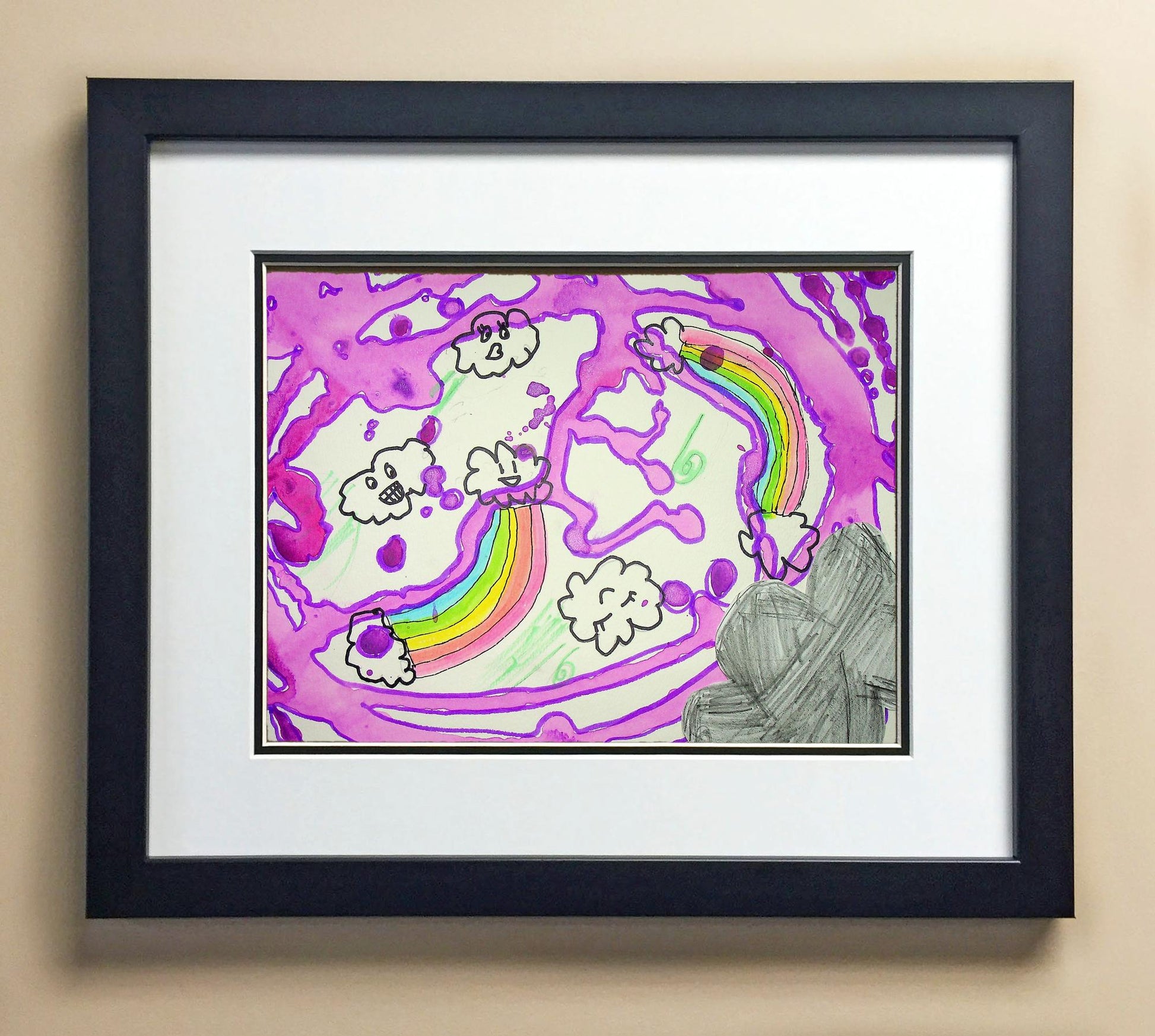 Included with the purchase is the Students Artwork, Frame, double matboard, shatter proof plexiglass, and a ready to hang backerboard with turnbuttons