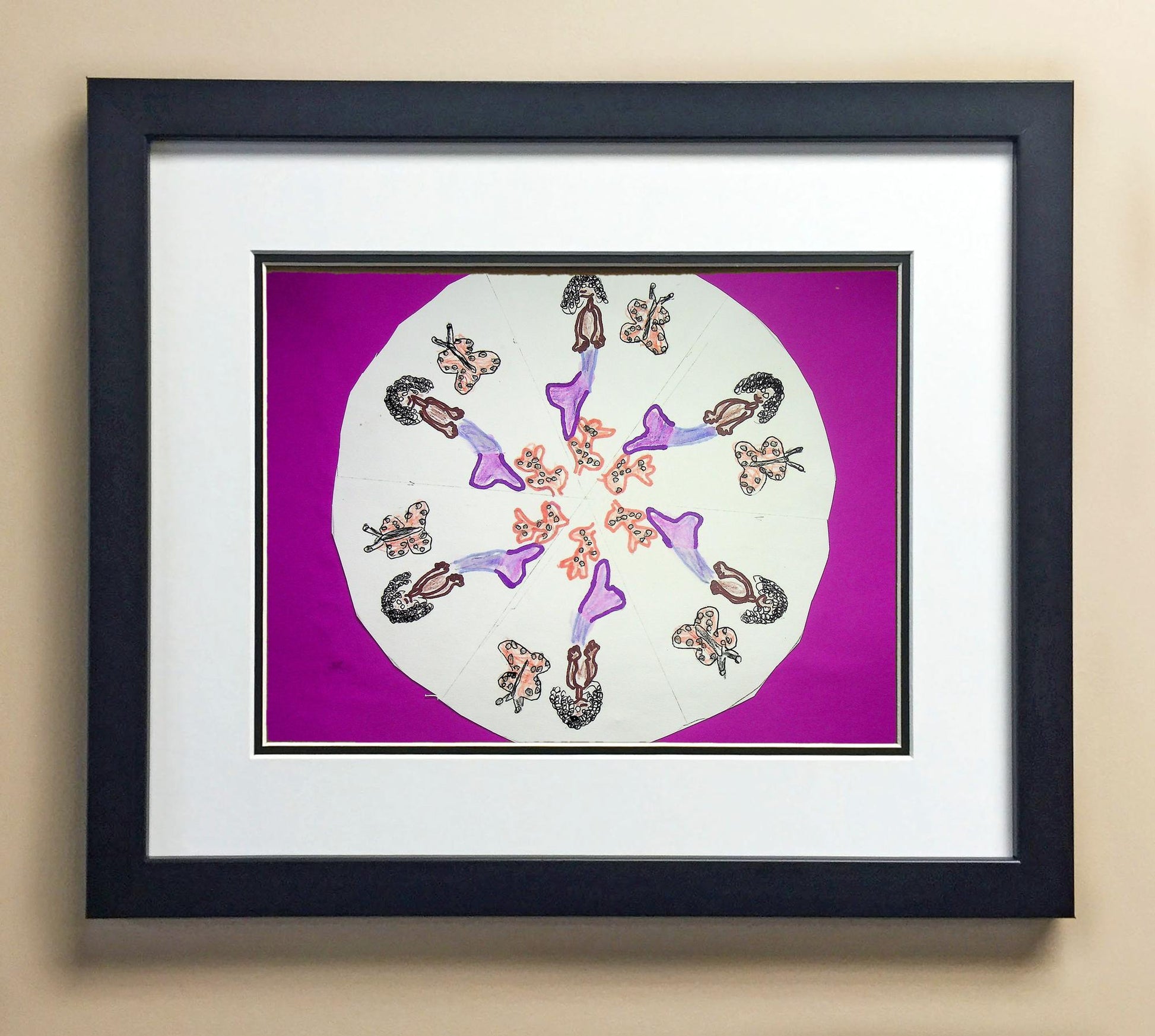 Included with the purchase is the Students Artwork, Frame, double matboard, shatter proof plexiglass, and a ready to hang backerboard with turnbuttons