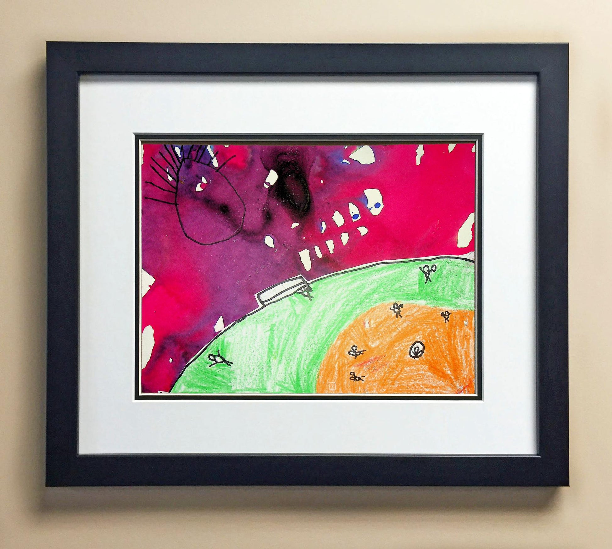 Included with the purchase is the Students Artwork, Frame, double matboard, shatter proof plexiglass, and a ready to hang backerboard with turnbuttons