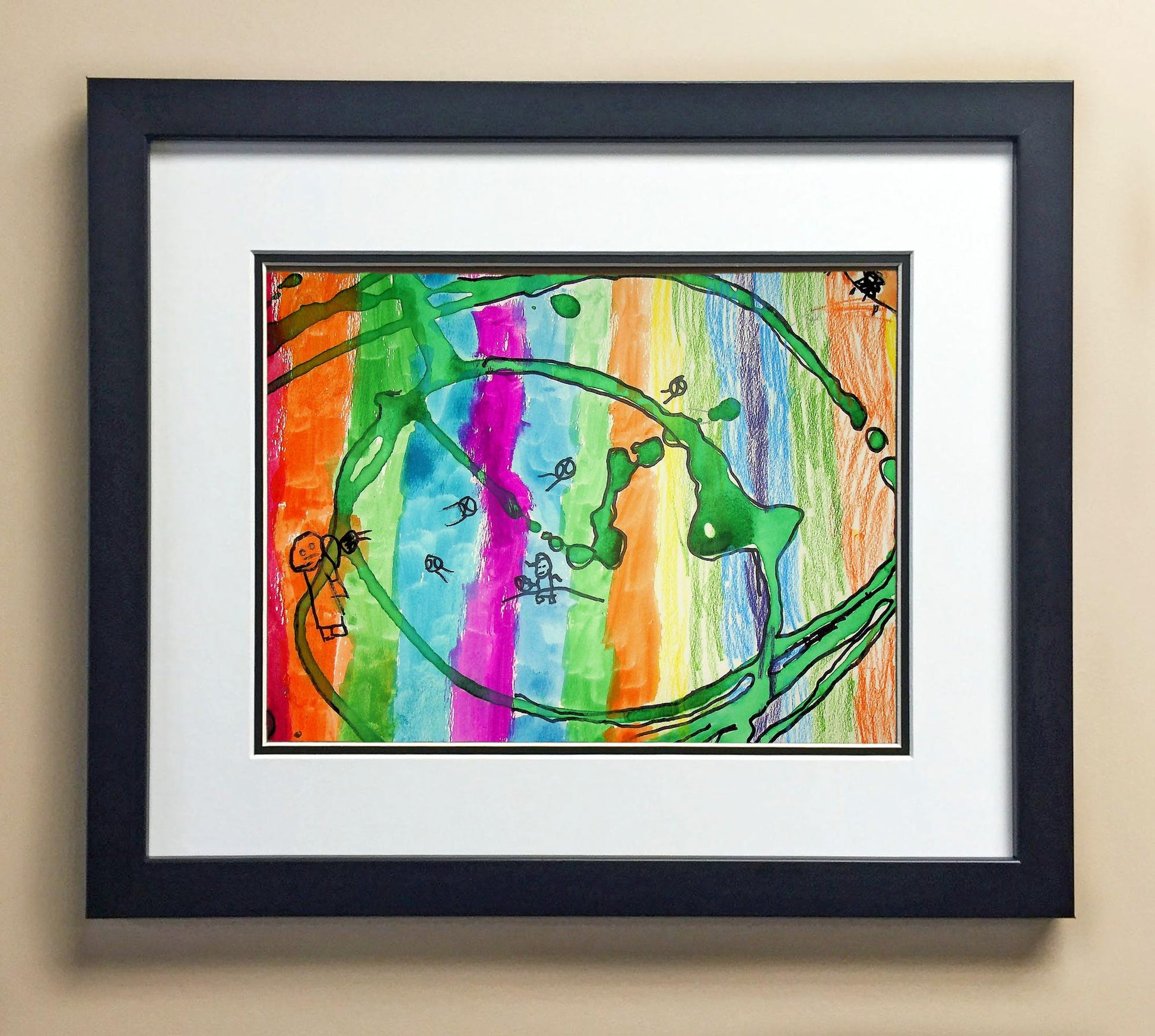 Included with the purchase is the Students Artwork, Frame, double matboard, shatter proof plexiglass, and a ready to hang backerboard with turnbuttons