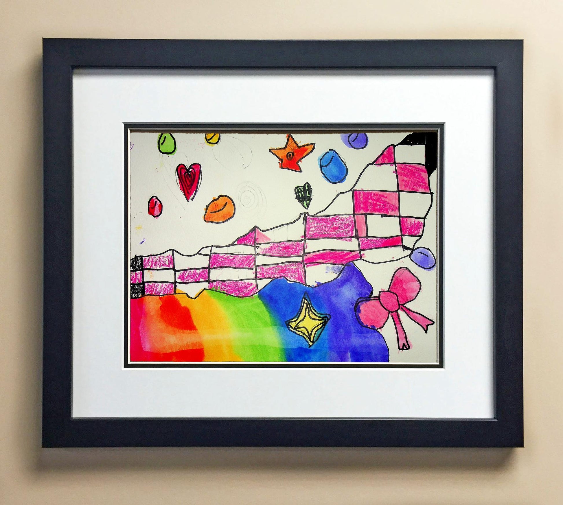 Included with the purchase is the Students Artwork, Frame, double matboard, shatter proof plexiglass, and a ready to hang backerboard with turnbuttons