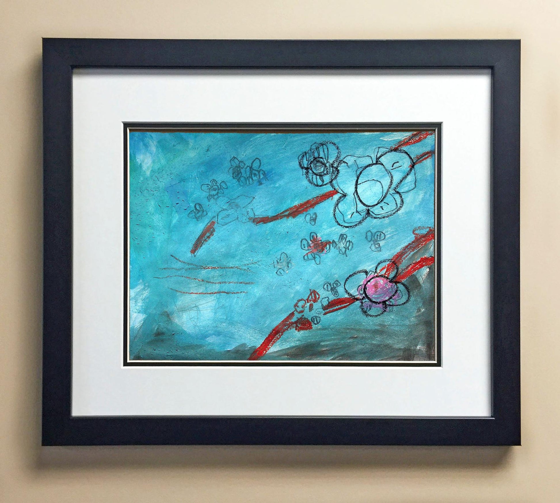 Included with the purchase is the Students Artwork, Frame, double matboard, shatter proof plexiglass, and a ready to hang backerboard with turnbuttons