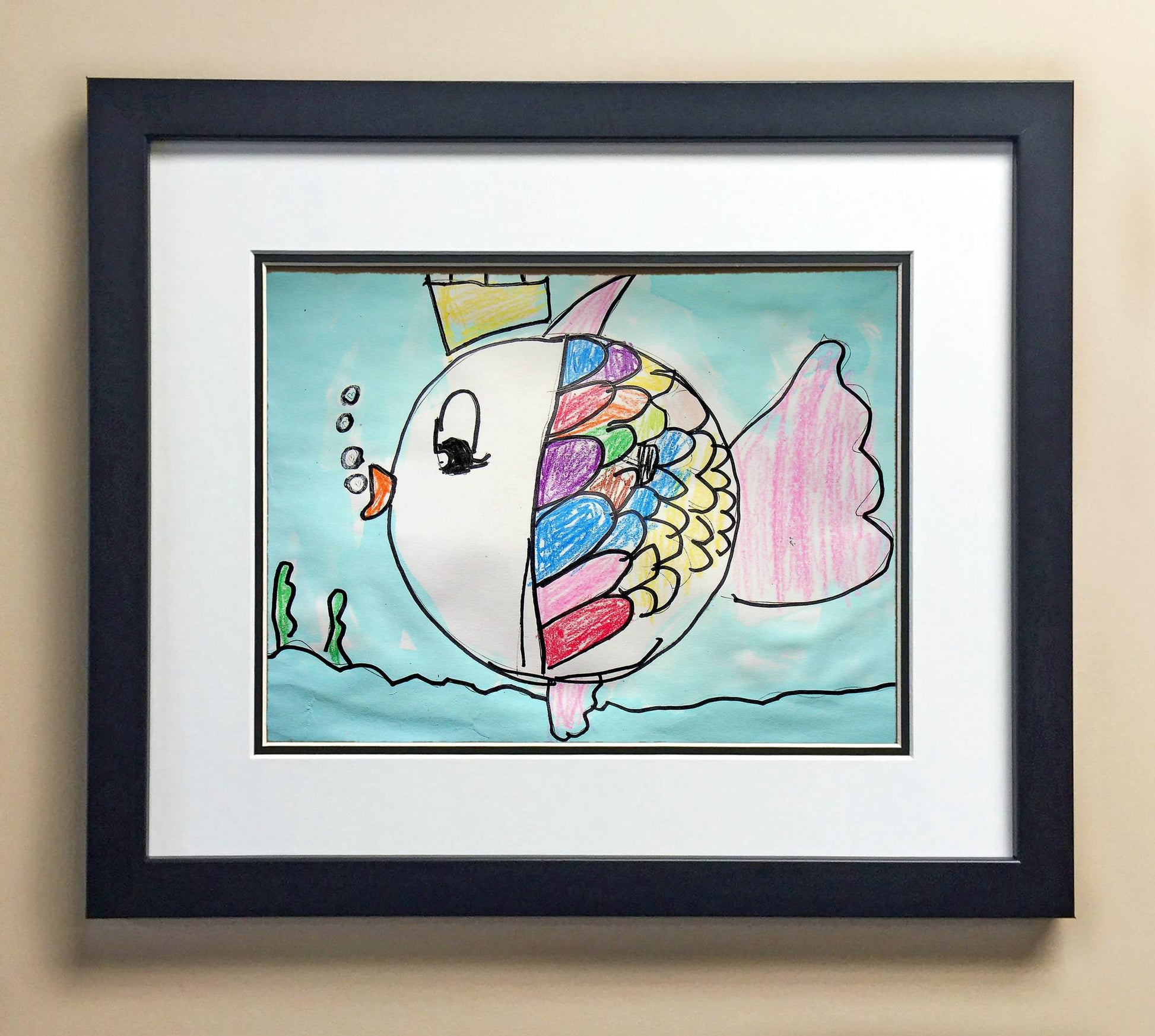 Included with the purchase is the Students Artwork, Frame, double matboard, shatter proof plexiglass, and a ready to hang backerboard with turnbuttons