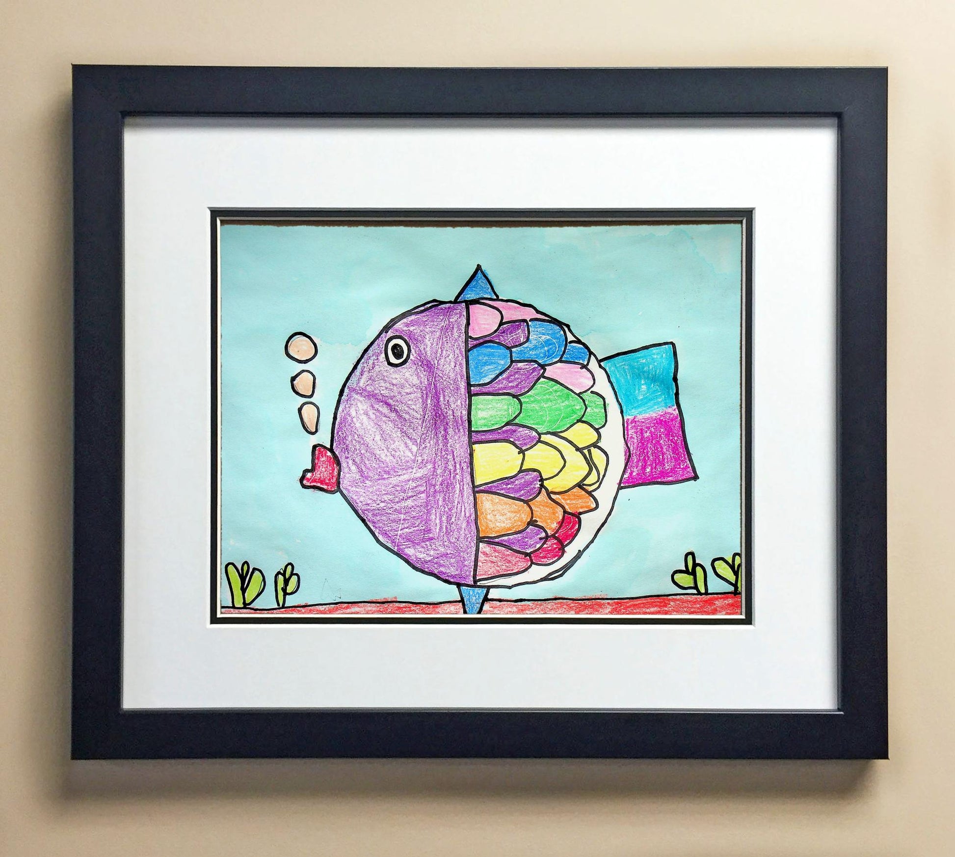 Included with the purchase is the Students Artwork, Frame, double matboard, shatter proof plexiglass, and a ready to hang backerboard with turnbuttons