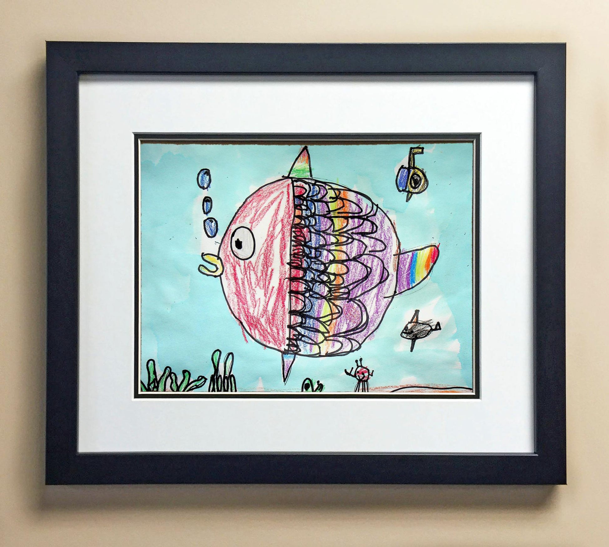 Included with the purchase is the Students Artwork, Frame, double matboard, shatter proof plexiglass, and a ready to hang backerboard with turnbuttons