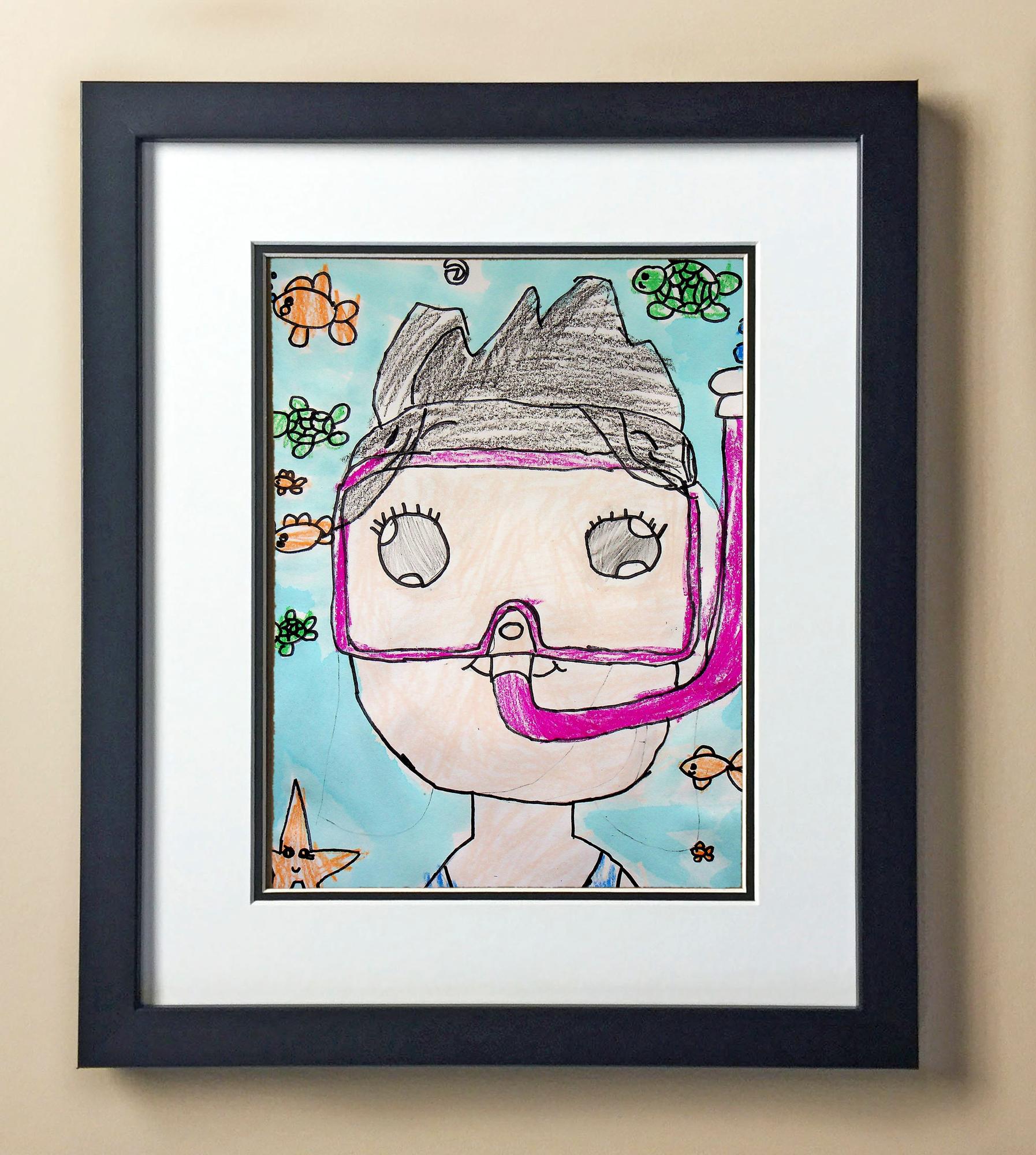Included with the purchase is the Students Artwork, Frame, double matboard, shatter proof plexiglass, and a ready to hang backerboard with turnbuttons