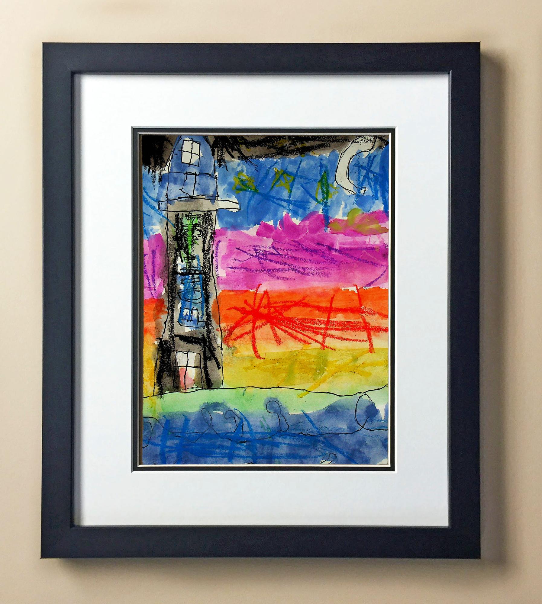 Included with the purchase is the Students Artwork, Frame, double matboard, shatter proof plexiglass, and a ready to hang backerboard with turnbuttons