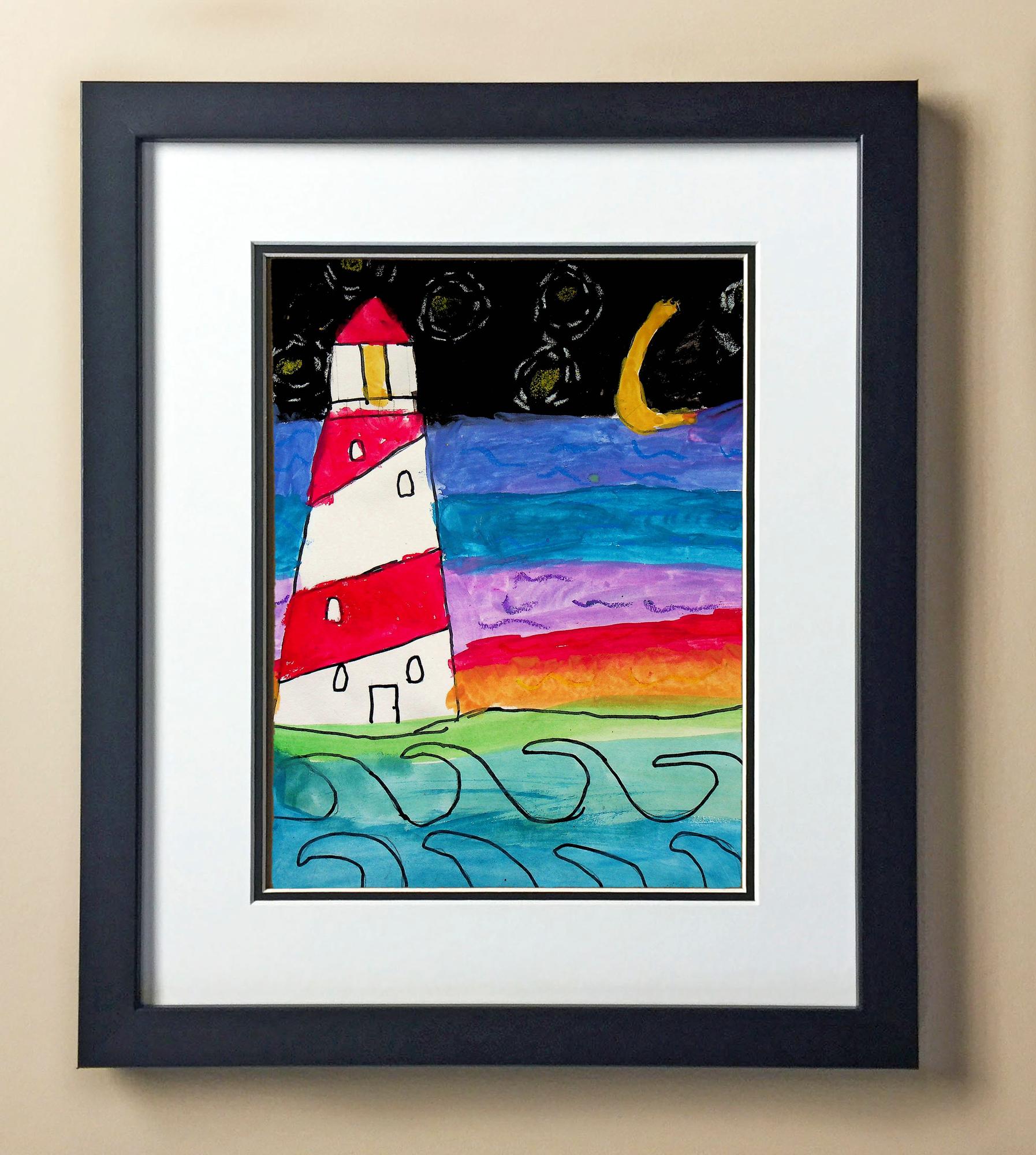 Included with the purchase is the Students Artwork, Frame, double matboard, shatter proof plexiglass, and a ready to hang backerboard with turnbuttons