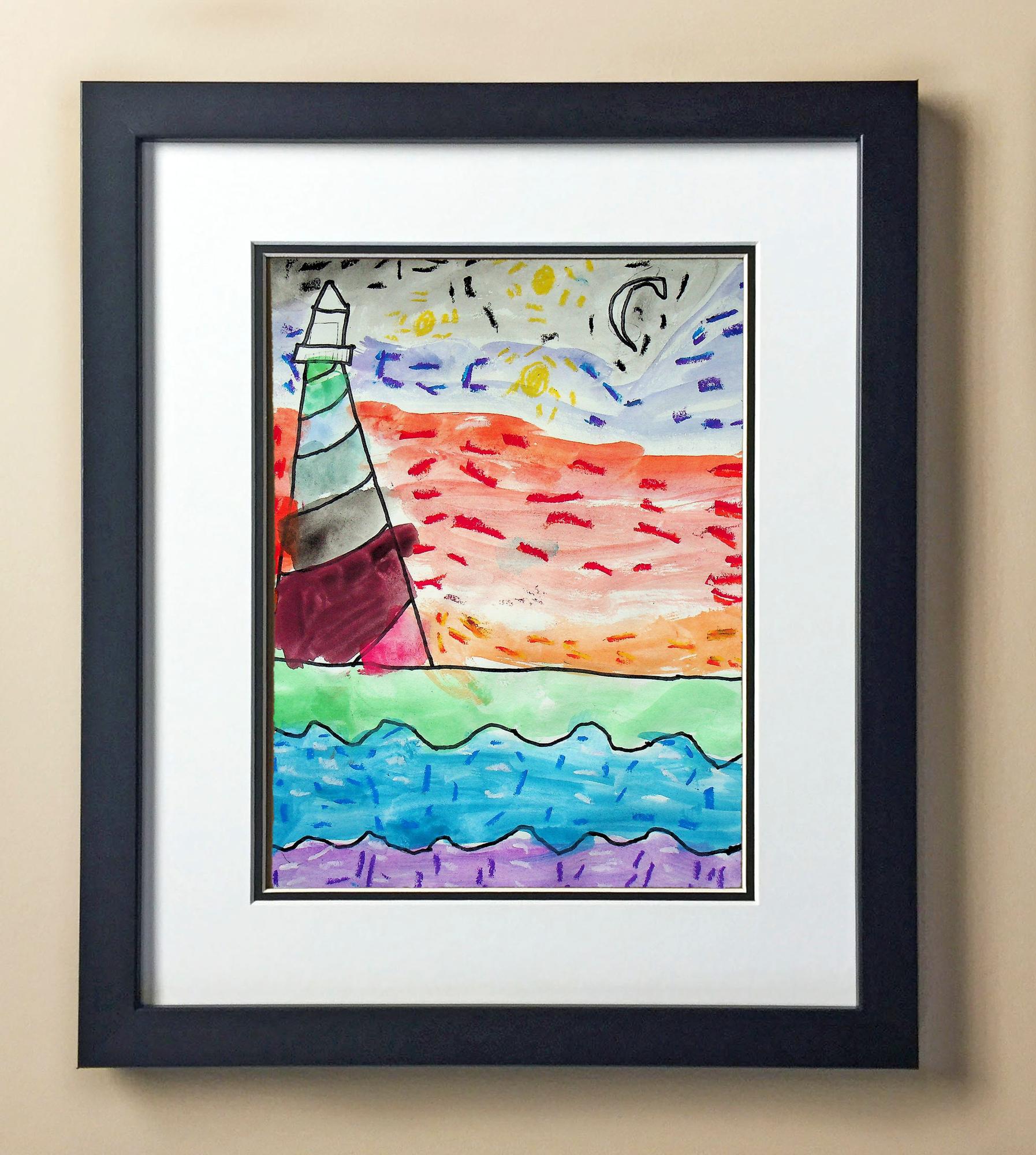 Included with the purchase is the Students Artwork, Frame, double matboard, shatter proof plexiglass, and a ready to hang backerboard with turnbuttons
