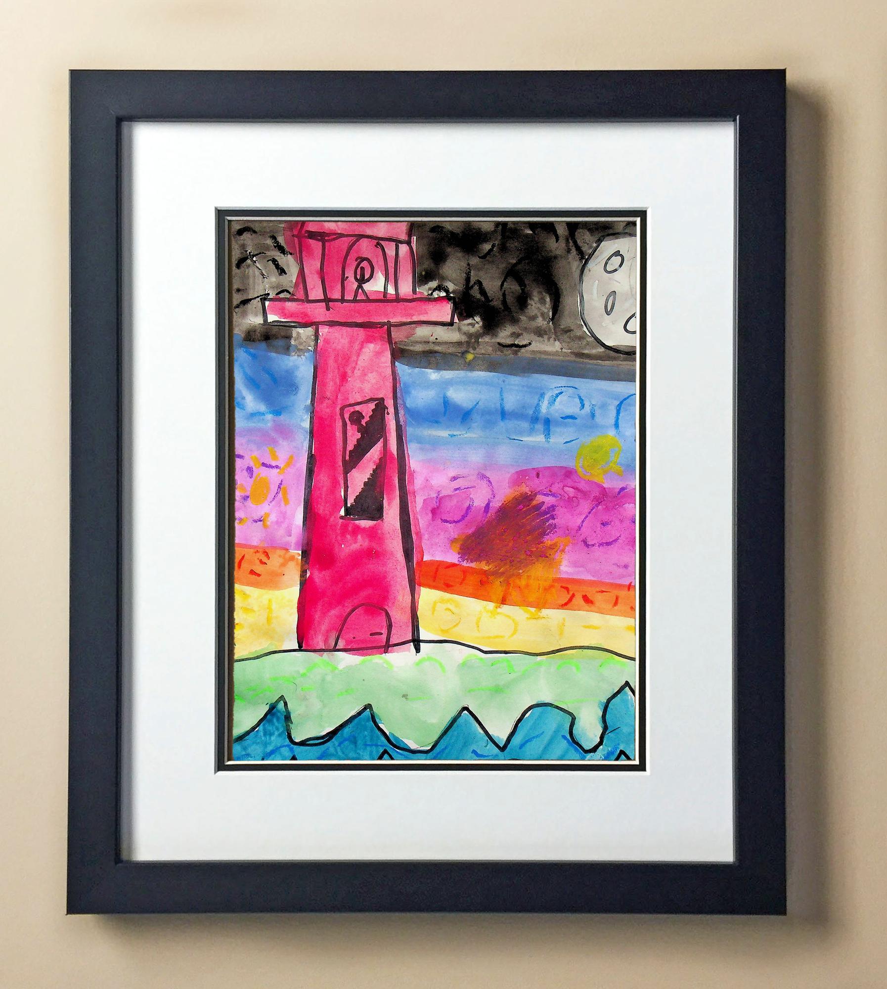 Included with the purchase is the Students Artwork, Frame, double matboard, shatter proof plexiglass, and a ready to hang backerboard with turnbuttons