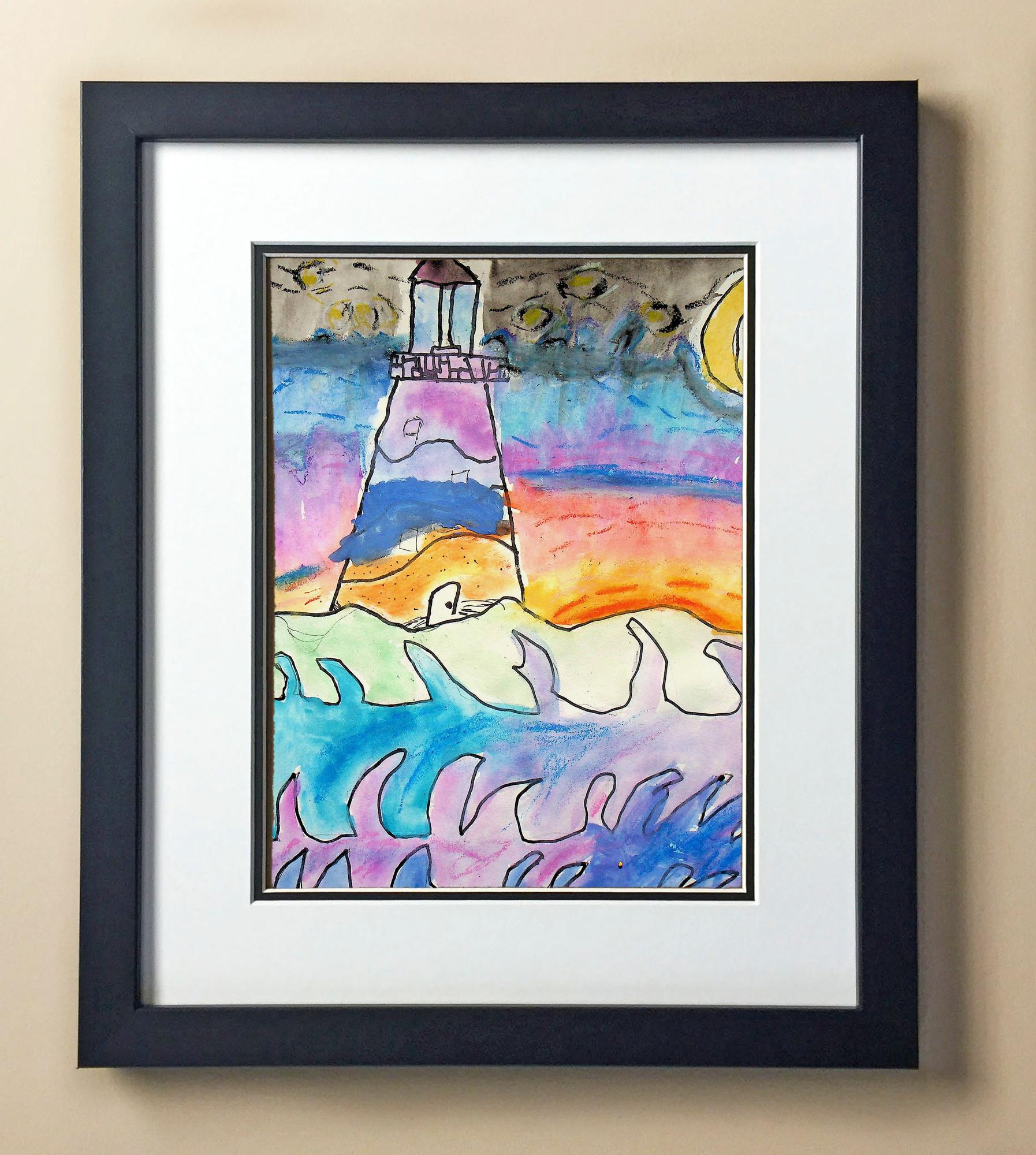 Included with the purchase is the Students Artwork, Frame, double matboard, shatter proof plexiglass, and a ready to hang backerboard with turnbuttons