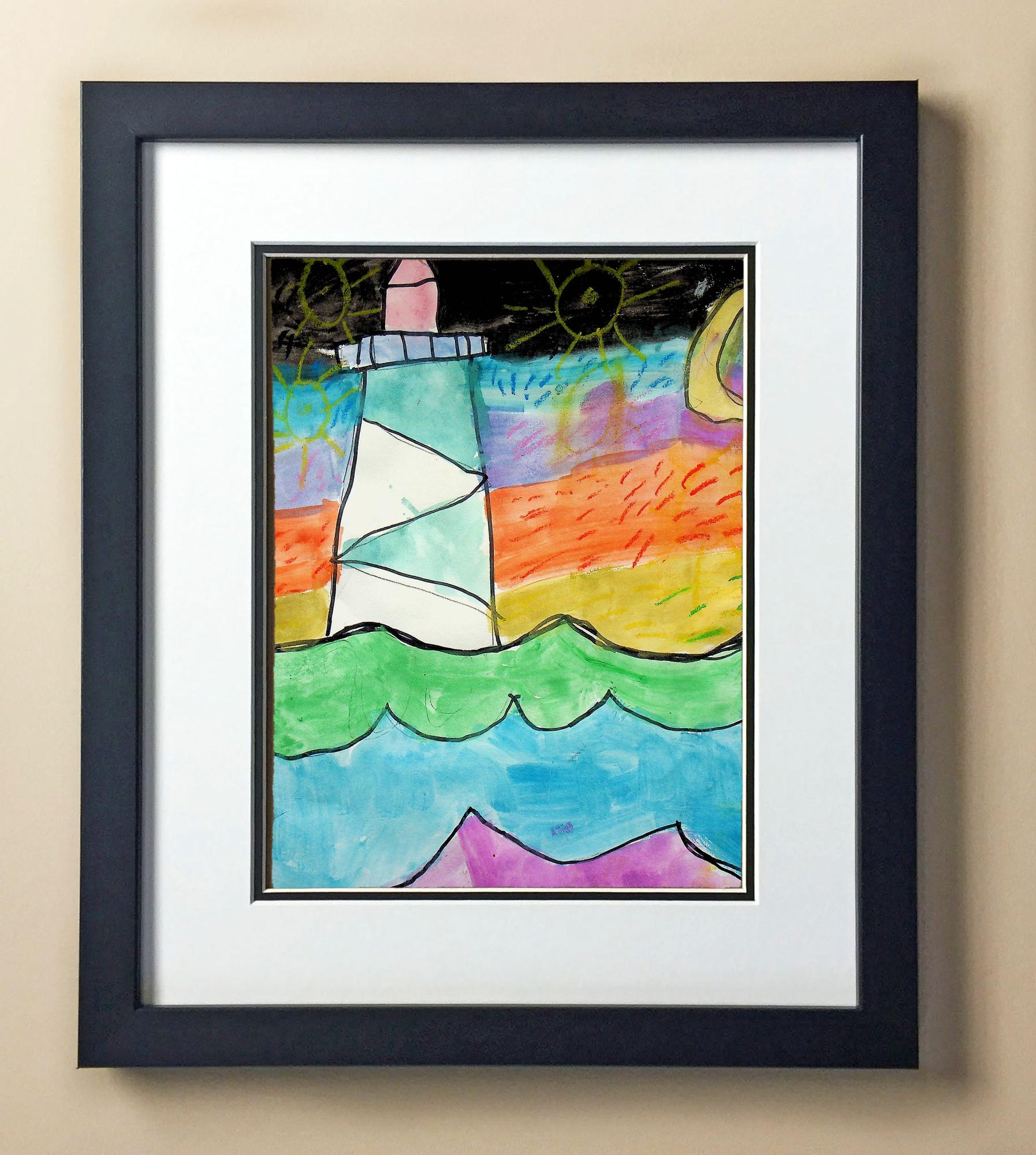 Included with the purchase is the Students Artwork, Frame, double matboard, shatter proof plexiglass, and a ready to hang backerboard with turnbuttons