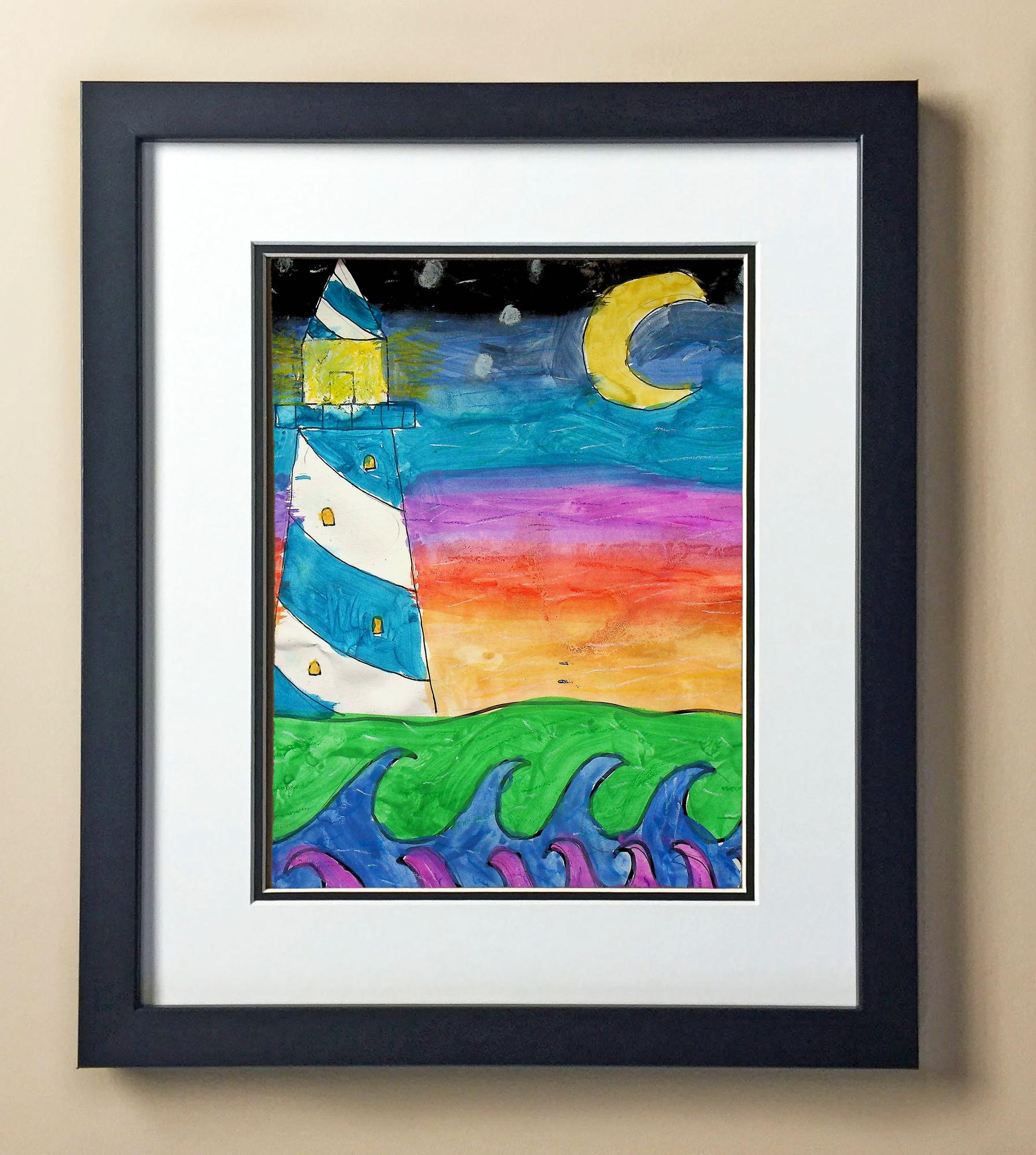 Included with the purchase is the Students Artwork, Frame, double matboard, shatter proof plexiglass, and a ready to hang backerboard with turnbuttons