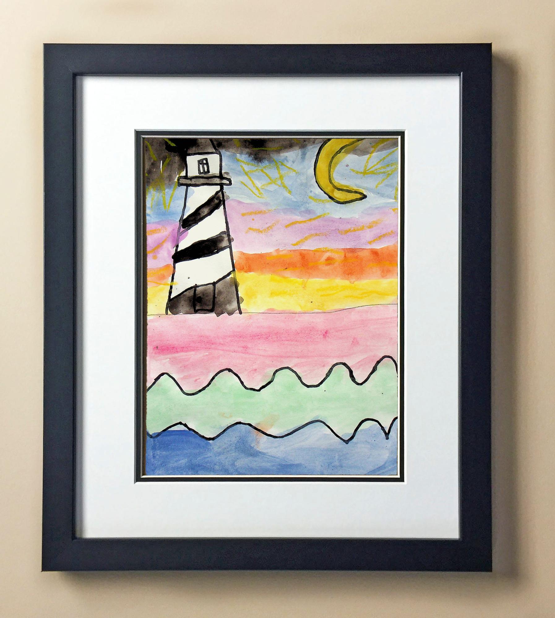 Included with the purchase is the Students Artwork, Frame, double matboard, shatter proof plexiglass, and a ready to hang backerboard with turnbuttons