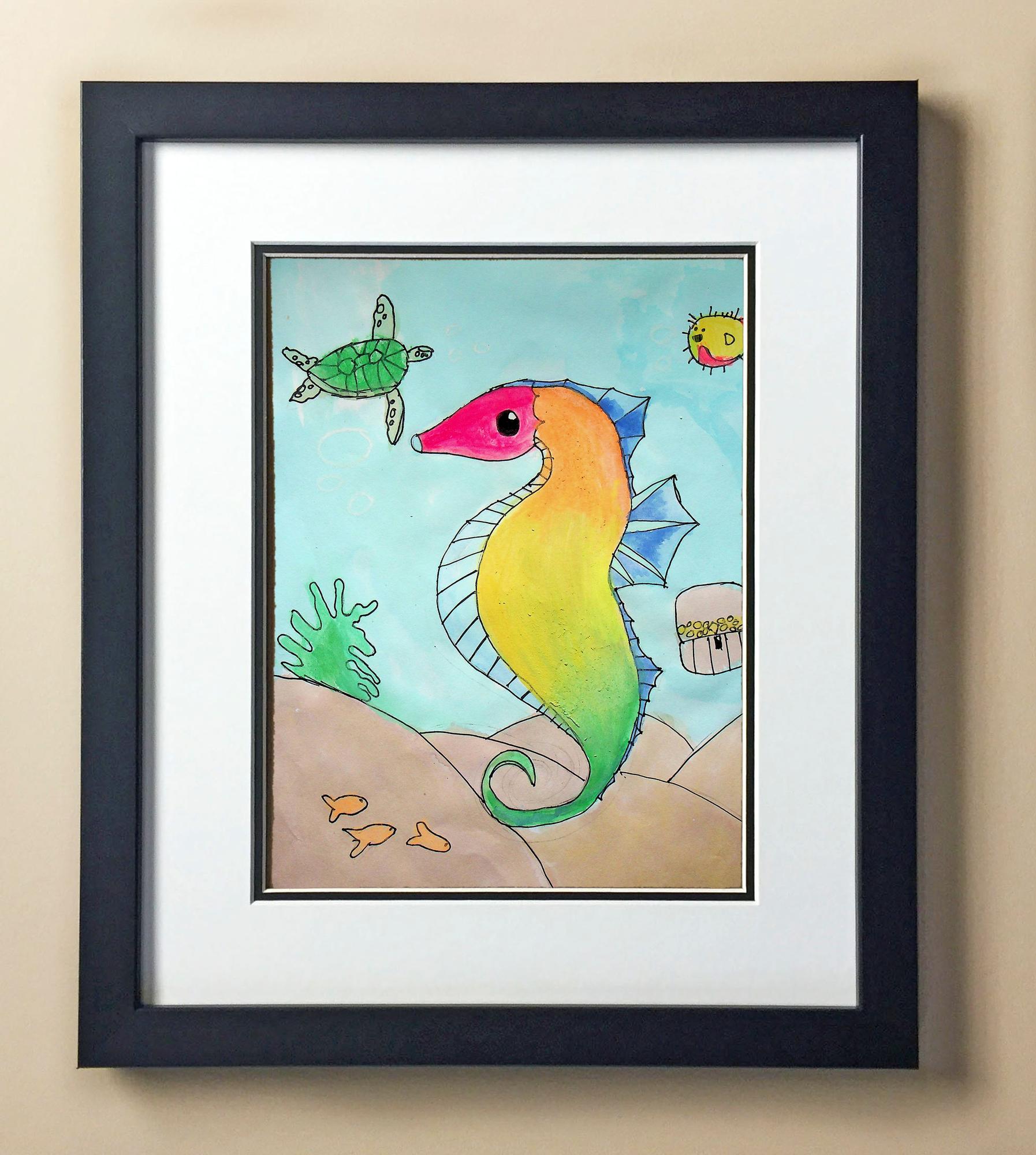 Included with the purchase is the Students Artwork, Frame, double matboard, shatter proof plexiglass, and a ready to hang backerboard with turnbuttons