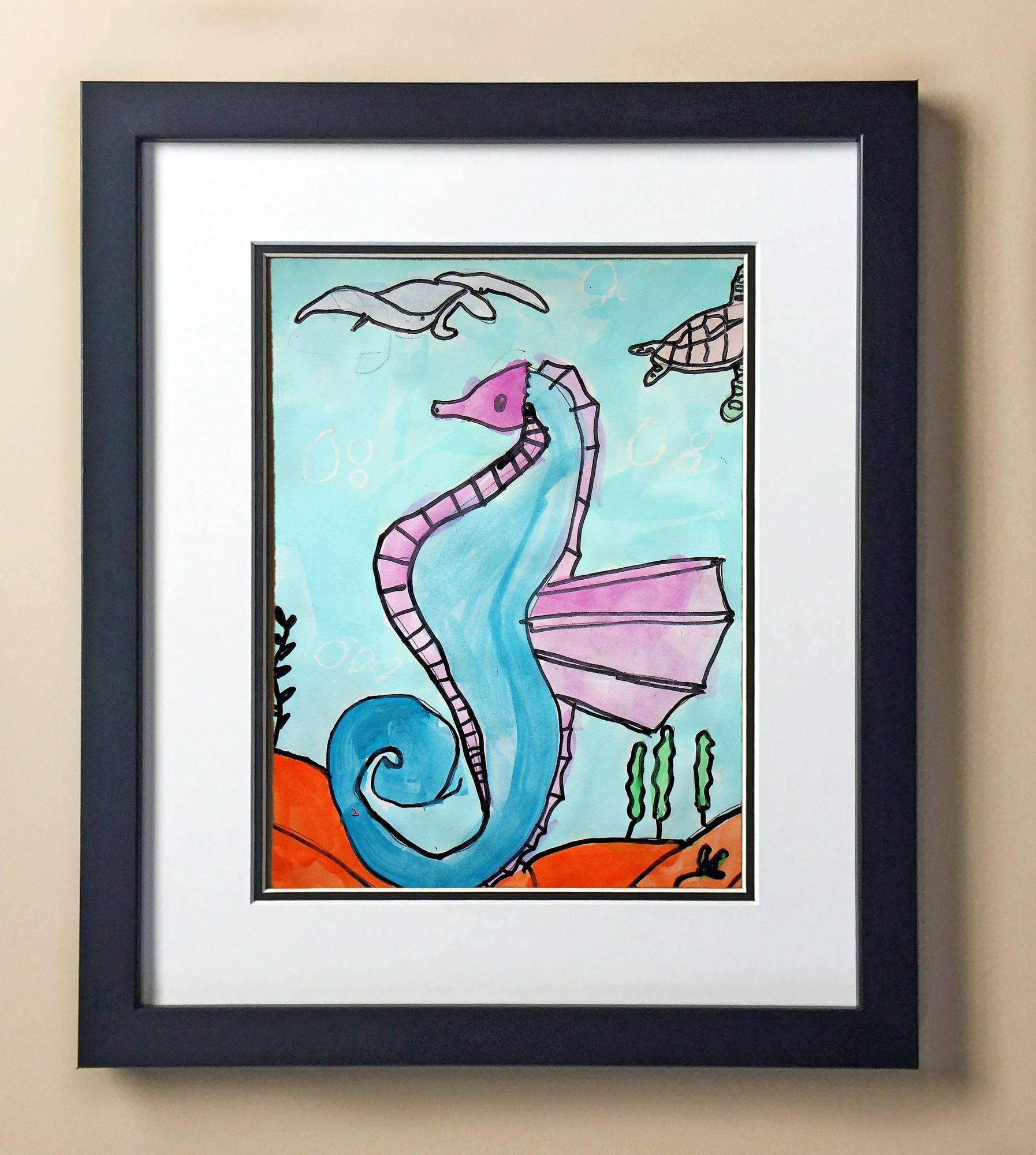 Included with the purchase is the Students Artwork, Frame, double matboard, shatter proof plexiglass, and a ready to hang backerboard with turnbuttons