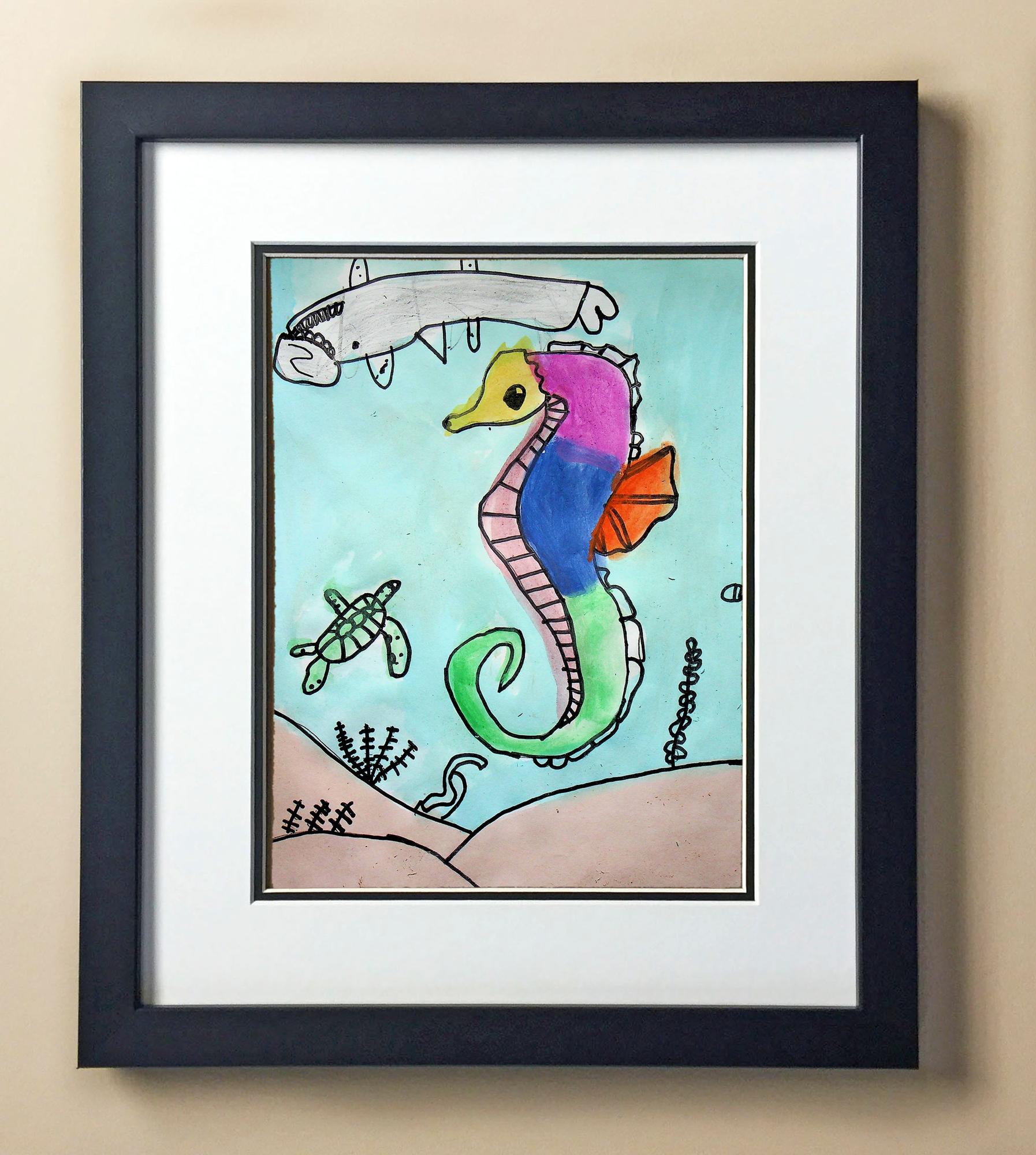 Included with the purchase is the Students Artwork, Frame, double matboard, shatter proof plexiglass, and a ready to hang backerboard with turnbuttons
