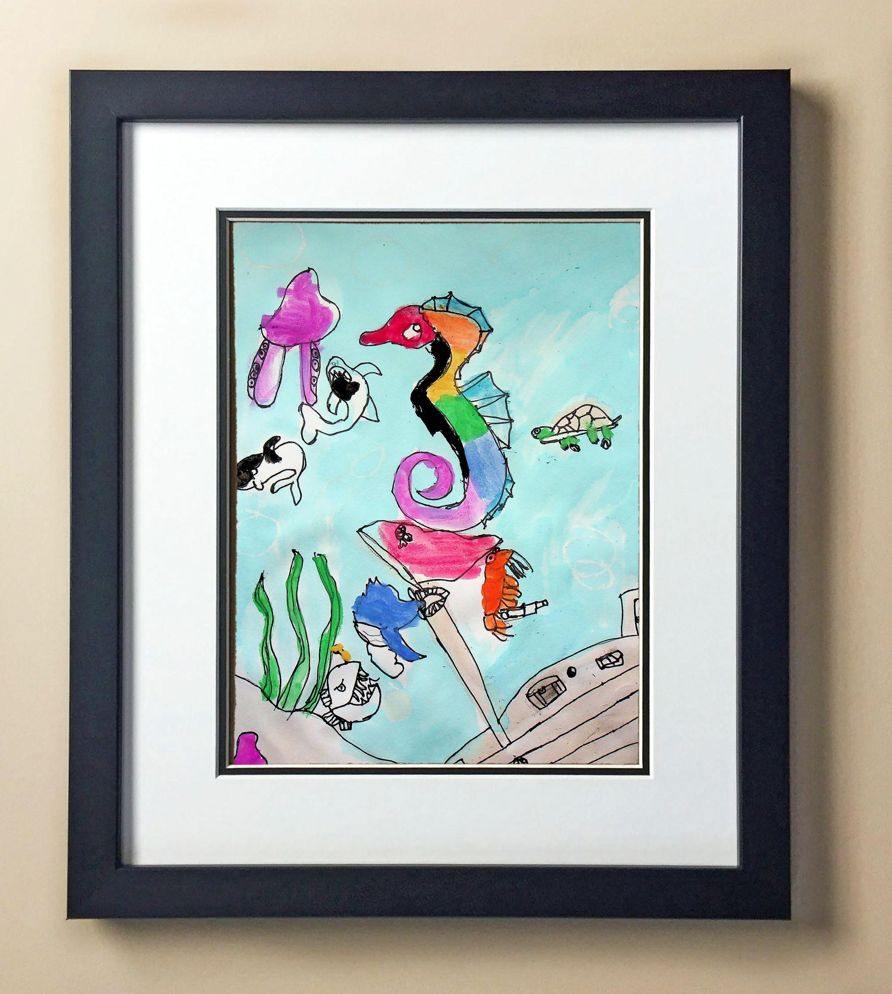 Included with the purchase is the Students Artwork, Frame, double matboard, shatter proof plexiglass, and a ready to hang backerboard with turnbuttons