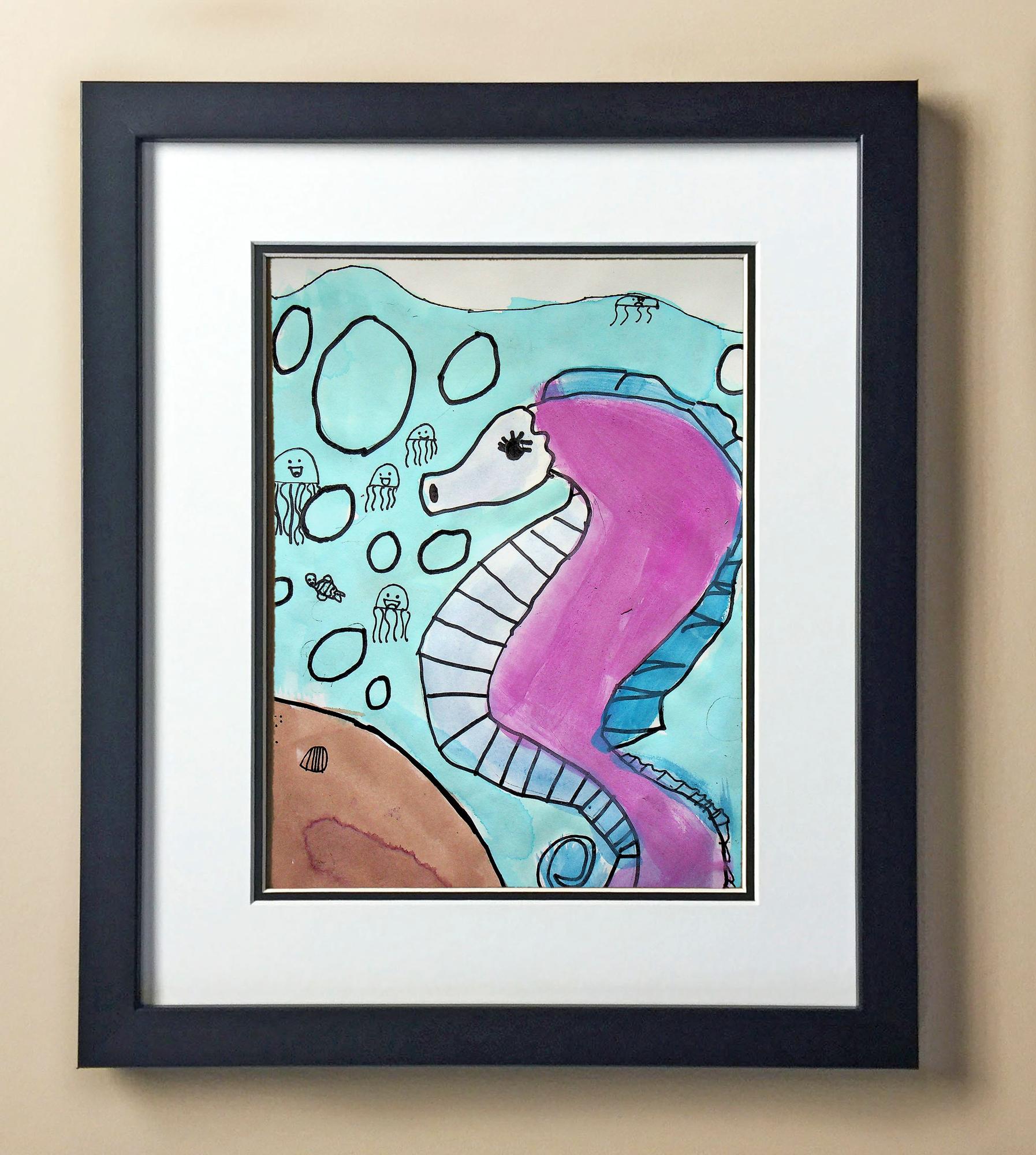 Included with the purchase is the Students Artwork, Frame, double matboard, shatter proof plexiglass, and a ready to hang backerboard with turnbuttons