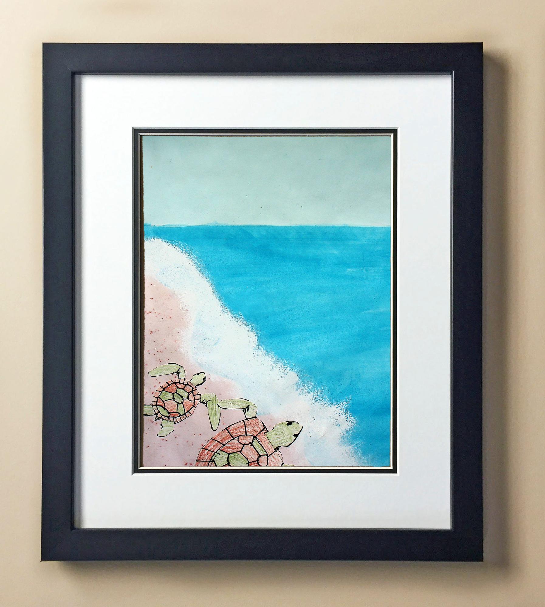 Included with the purchase is the Students Artwork, Frame, double matboard, shatter proof plexiglass, and a ready to hang backerboard with turnbuttons