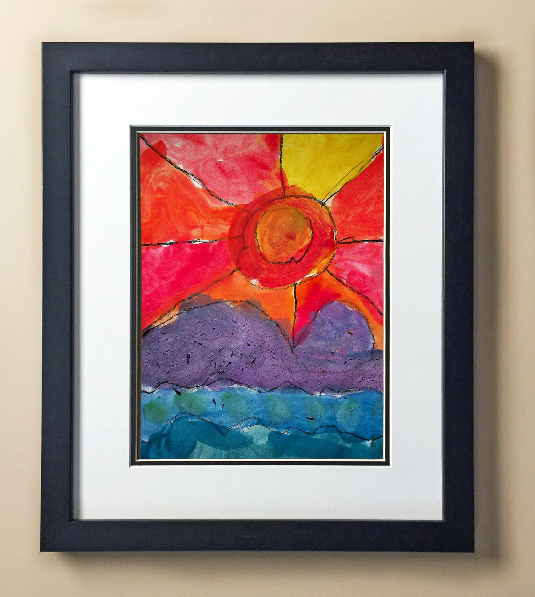 Included with the purchase is the Students Artwork, Frame, double matboard, shatter proof plexiglass, and a ready to hang backerboard with turnbuttons