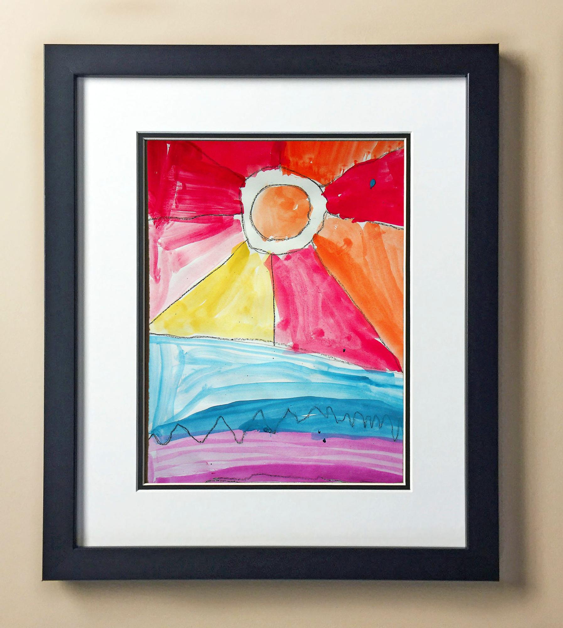 Included with the purchase is the Students Artwork, Frame, double matboard, shatter proof plexiglass, and a ready to hang backerboard with turnbuttons