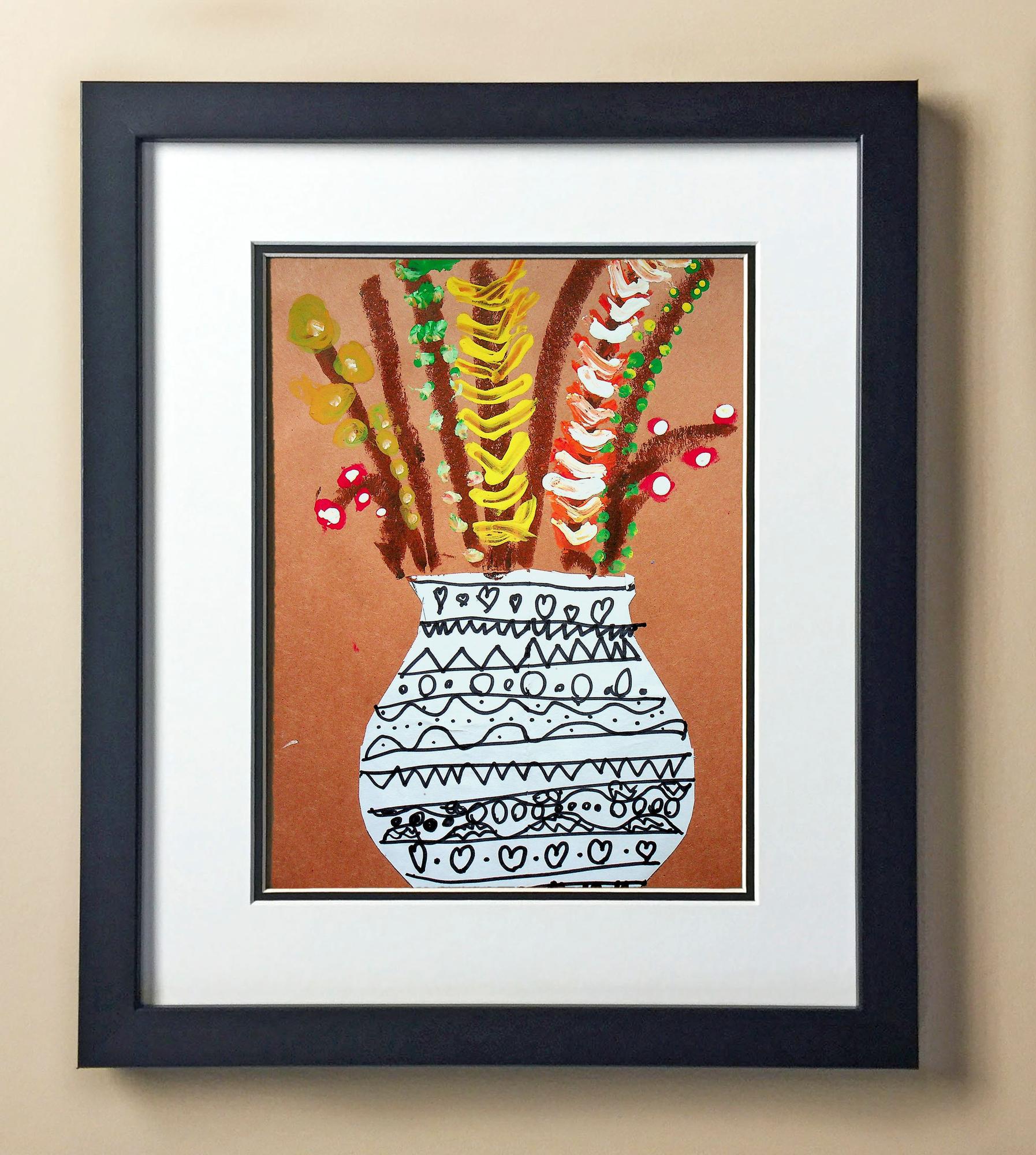 Included with the purchase is the Students Artwork, Frame, double matboard, shatter proof plexiglass, and a ready to hang backerboard with turnbuttons
