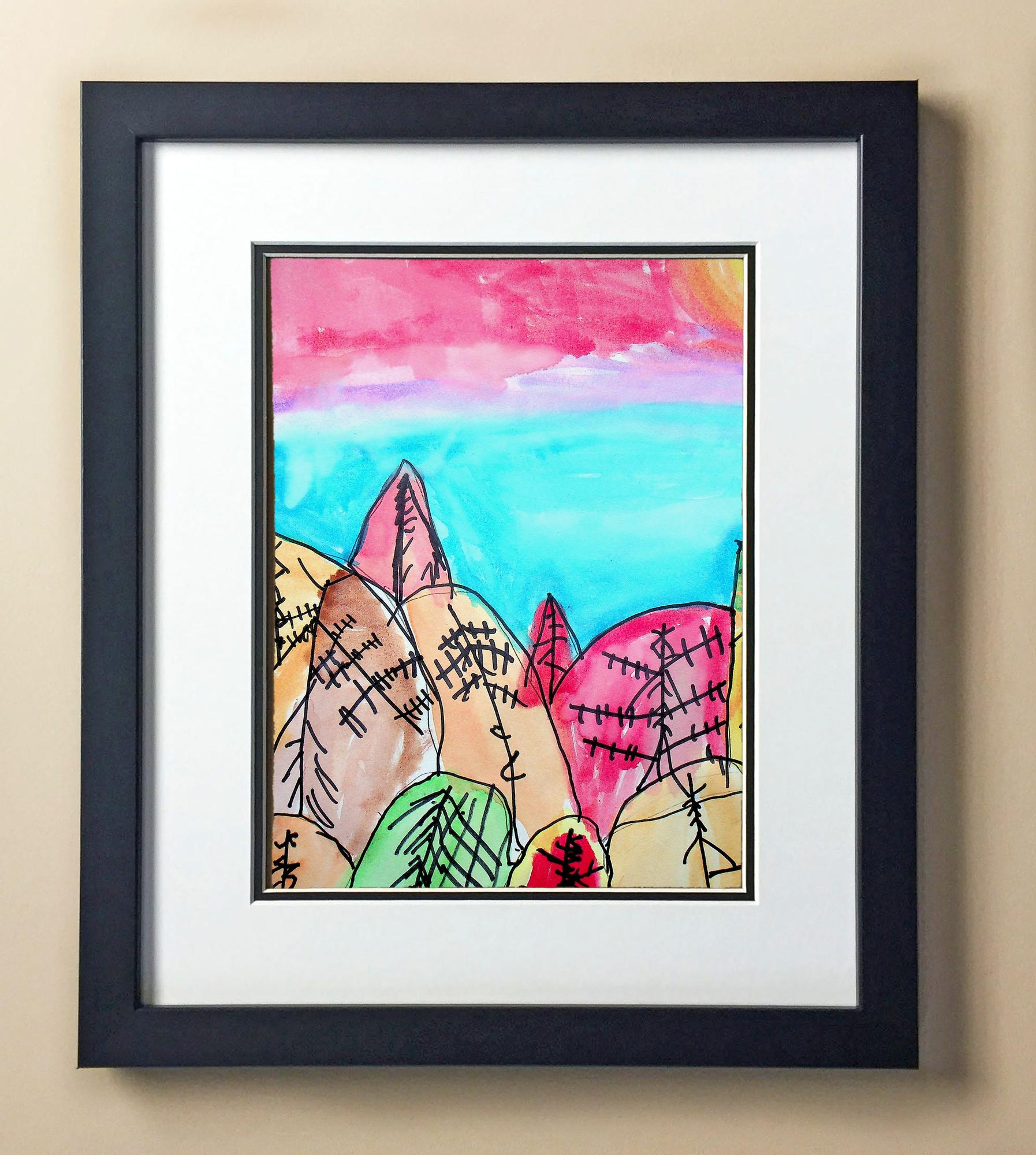 Included with the purchase is the Students Artwork, Frame, double matboard, shatter proof plexiglass, and a ready to hang backerboard with turnbuttons