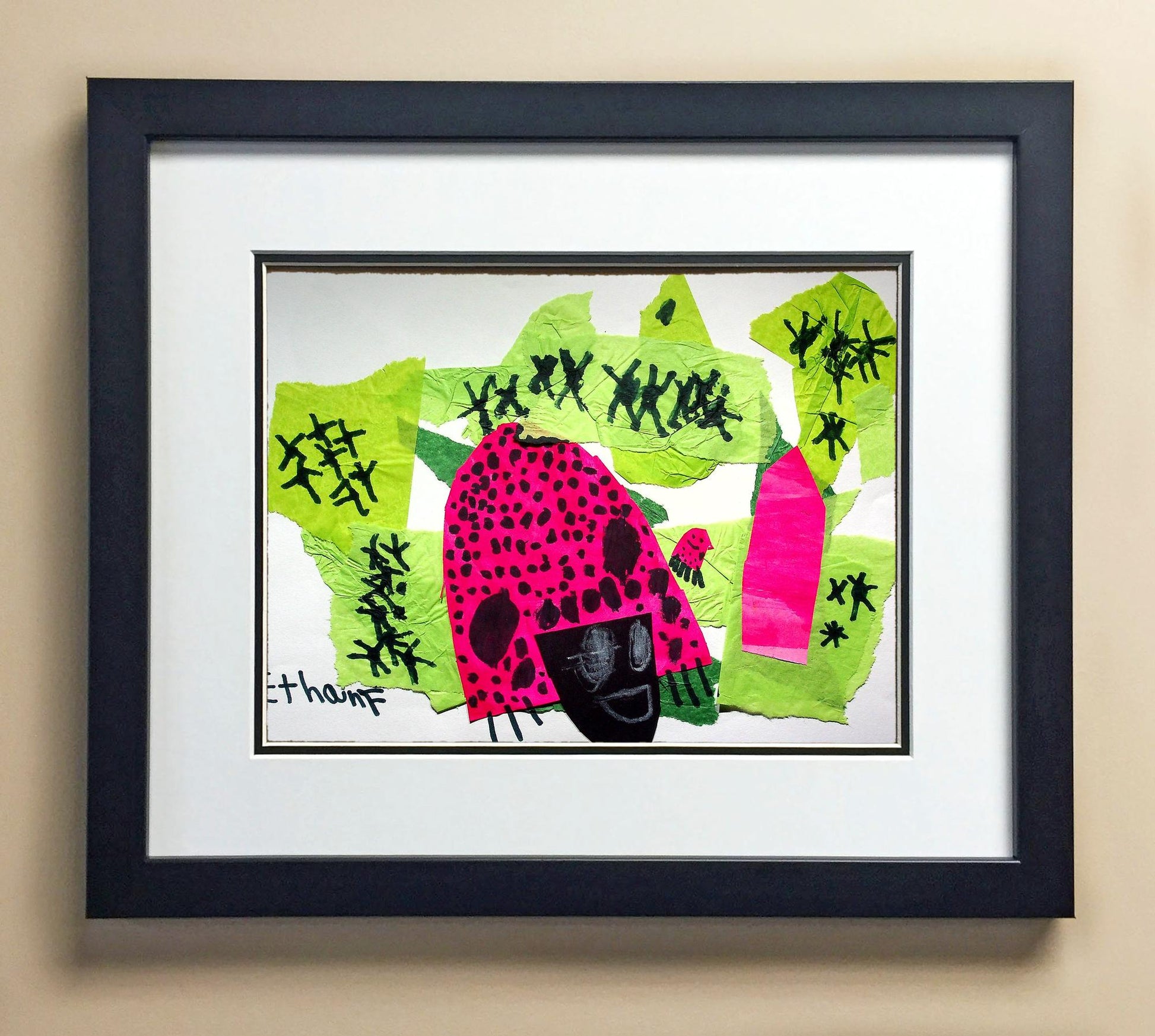 Included with the purchase is the Students Artwork, Frame, double matboard, shatter proof plexiglass, and a ready to hang backerboard with turnbuttons