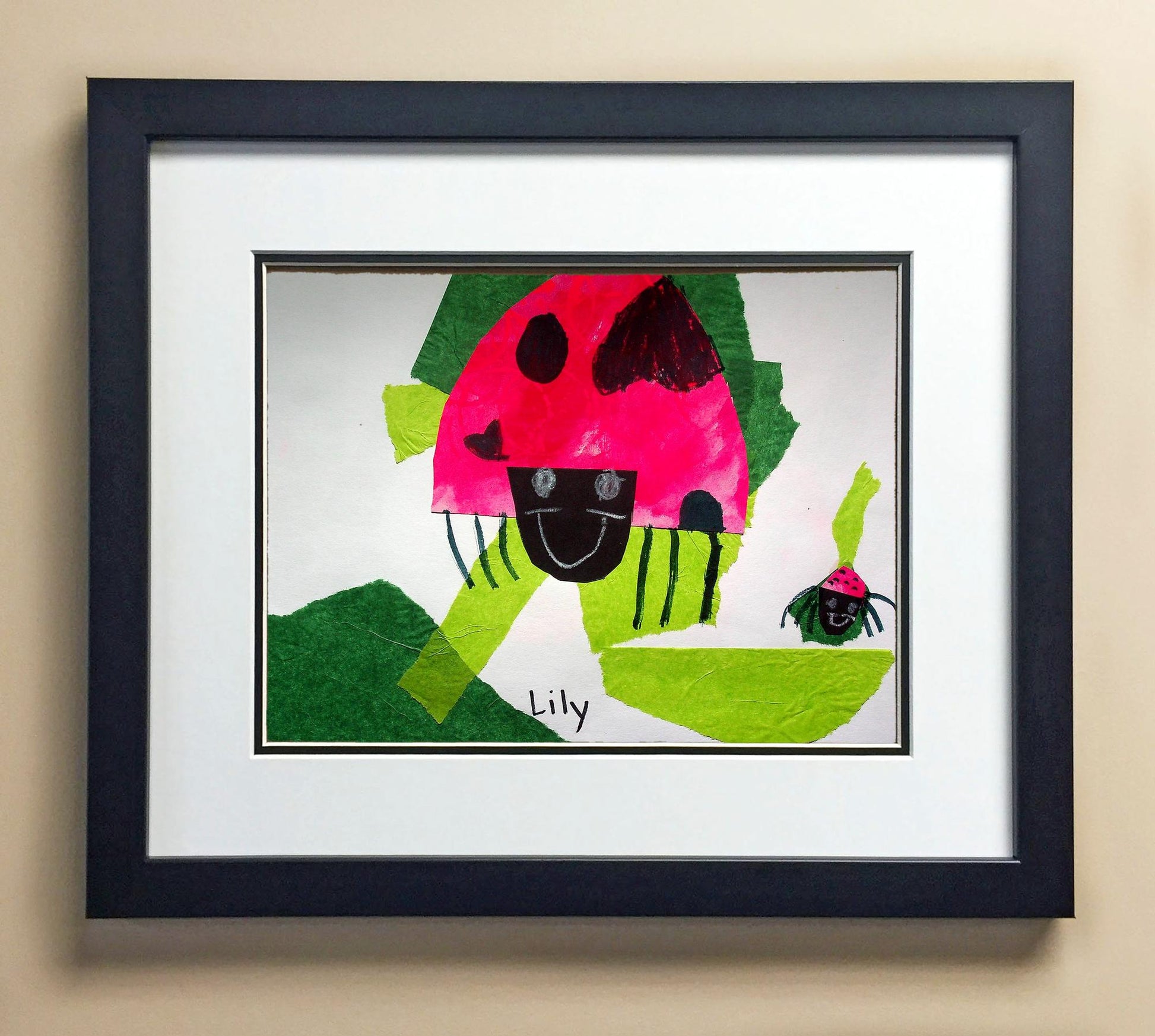 Included with the purchase is the Students Artwork, Frame, double matboard, shatter proof plexiglass, and a ready to hang backerboard with turnbuttons