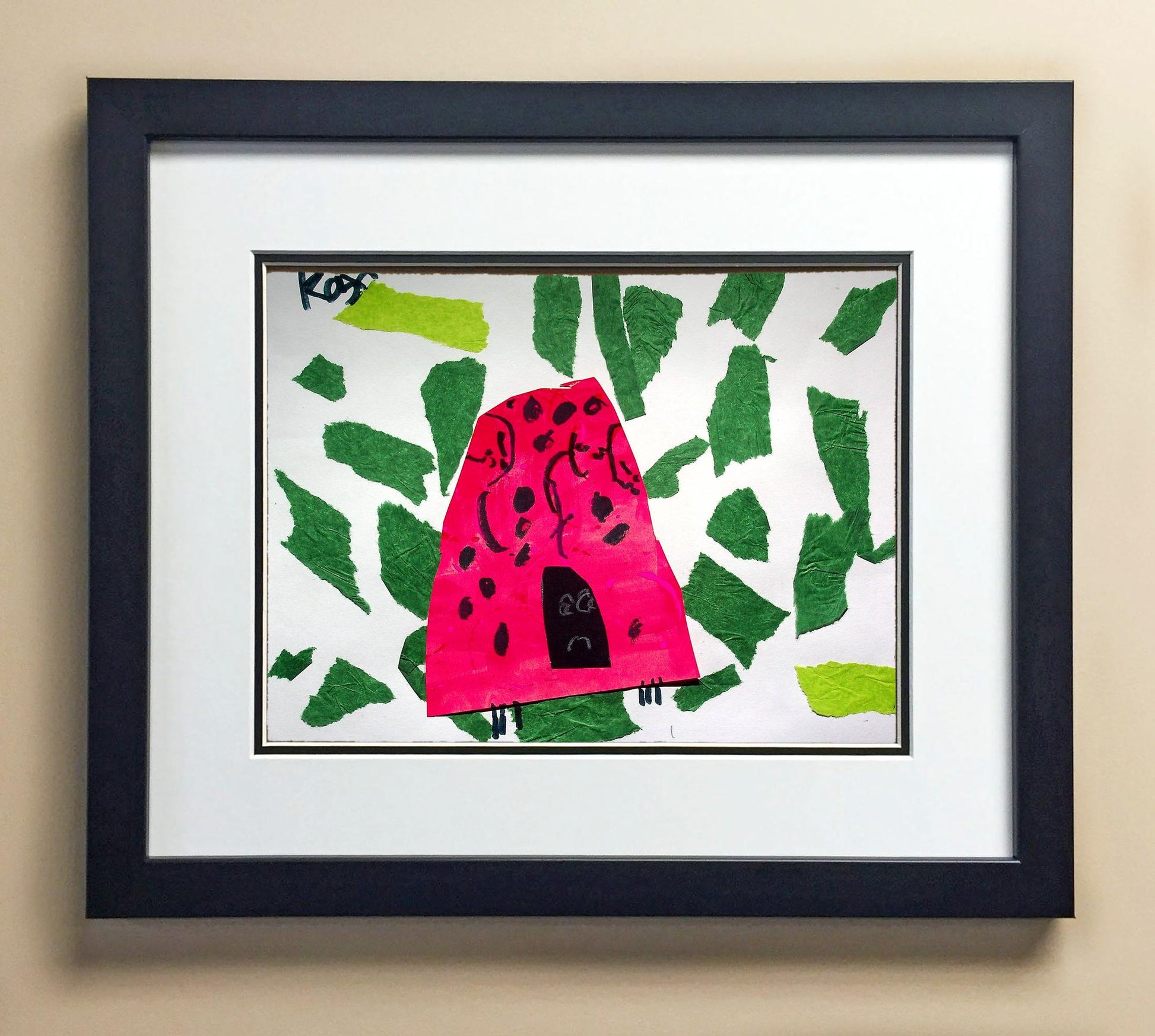Included with the purchase is the Students Artwork, Frame, double matboard, shatter proof plexiglass, and a ready to hang backerboard with turnbuttons