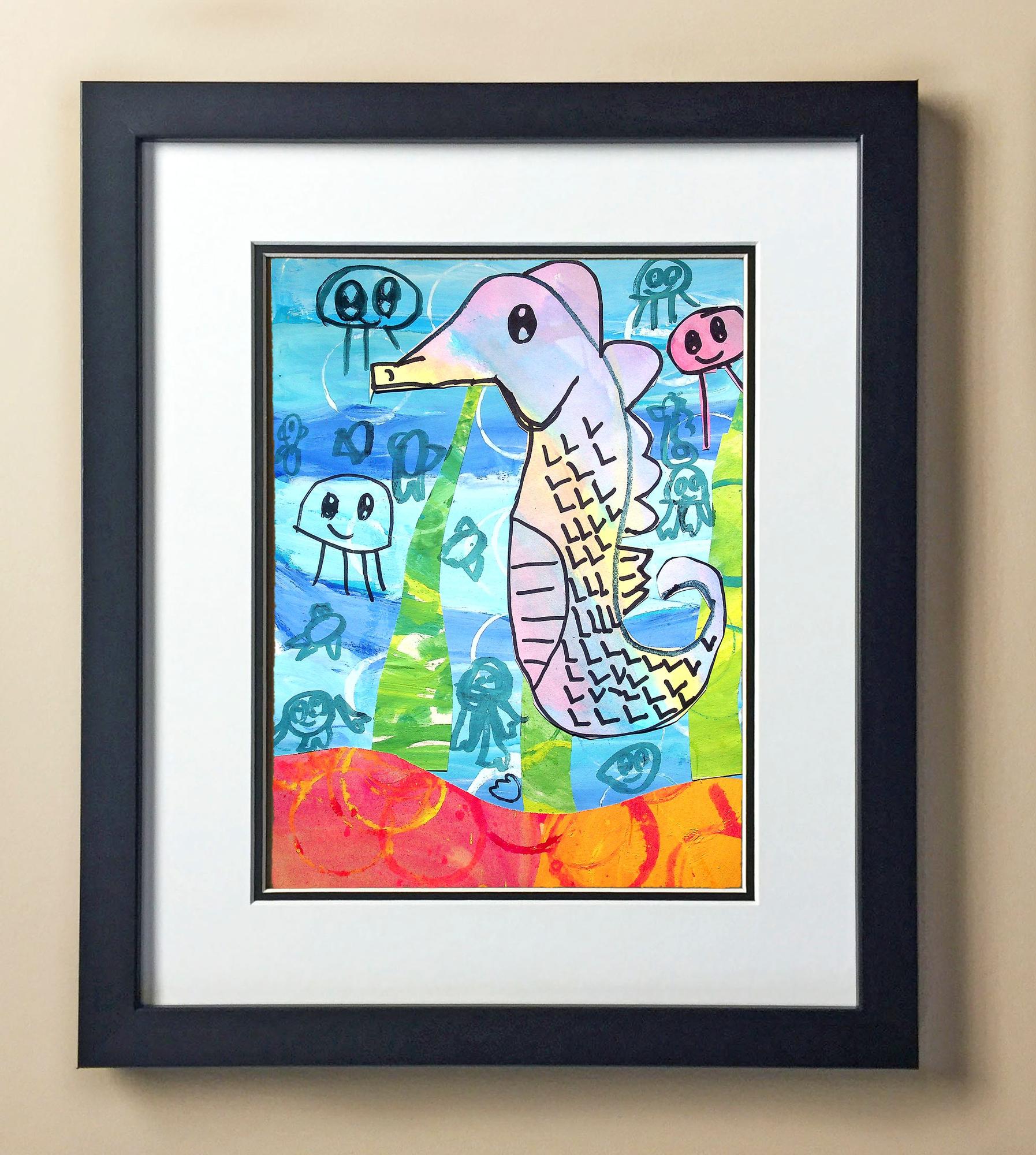 Included with the purchase is the Students Artwork, Frame, double matboard, shatter proof plexiglass, and a ready to hang backerboard with turnbuttons