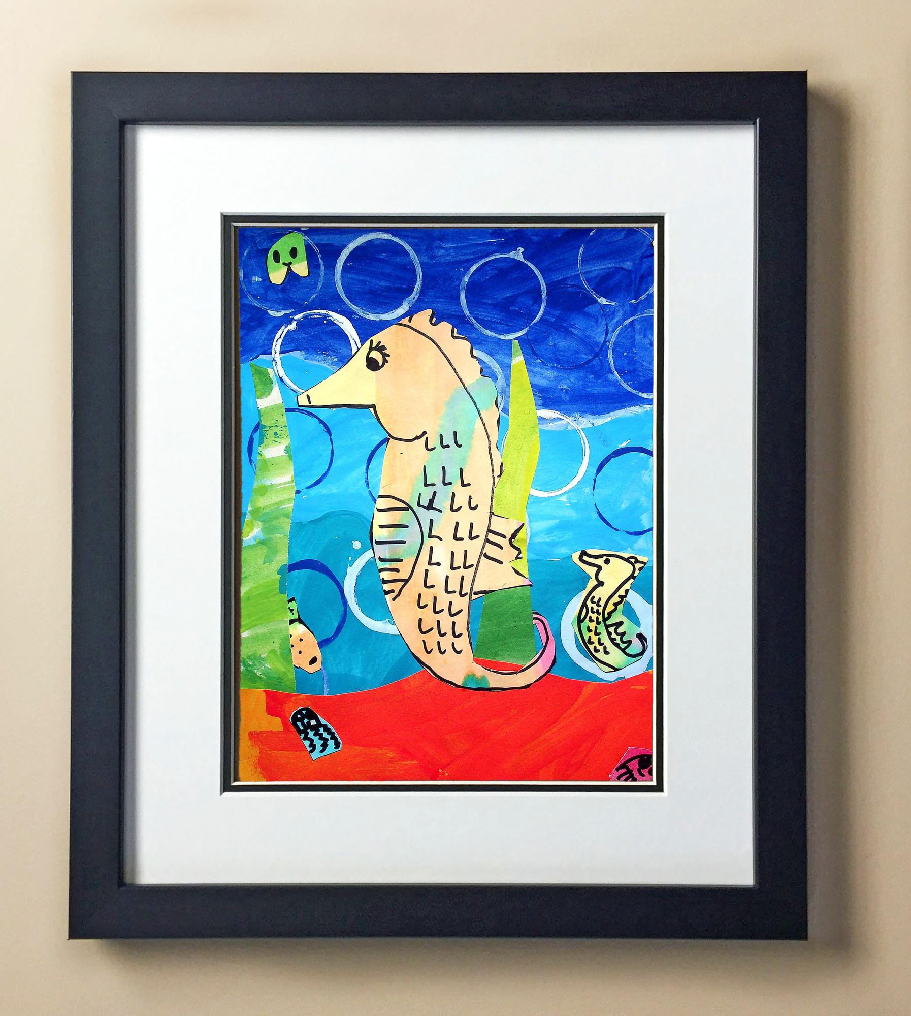 Included with the purchase is the Students Artwork, Frame, double matboard, shatter proof plexiglass, and a ready to hang backerboard with turnbuttons