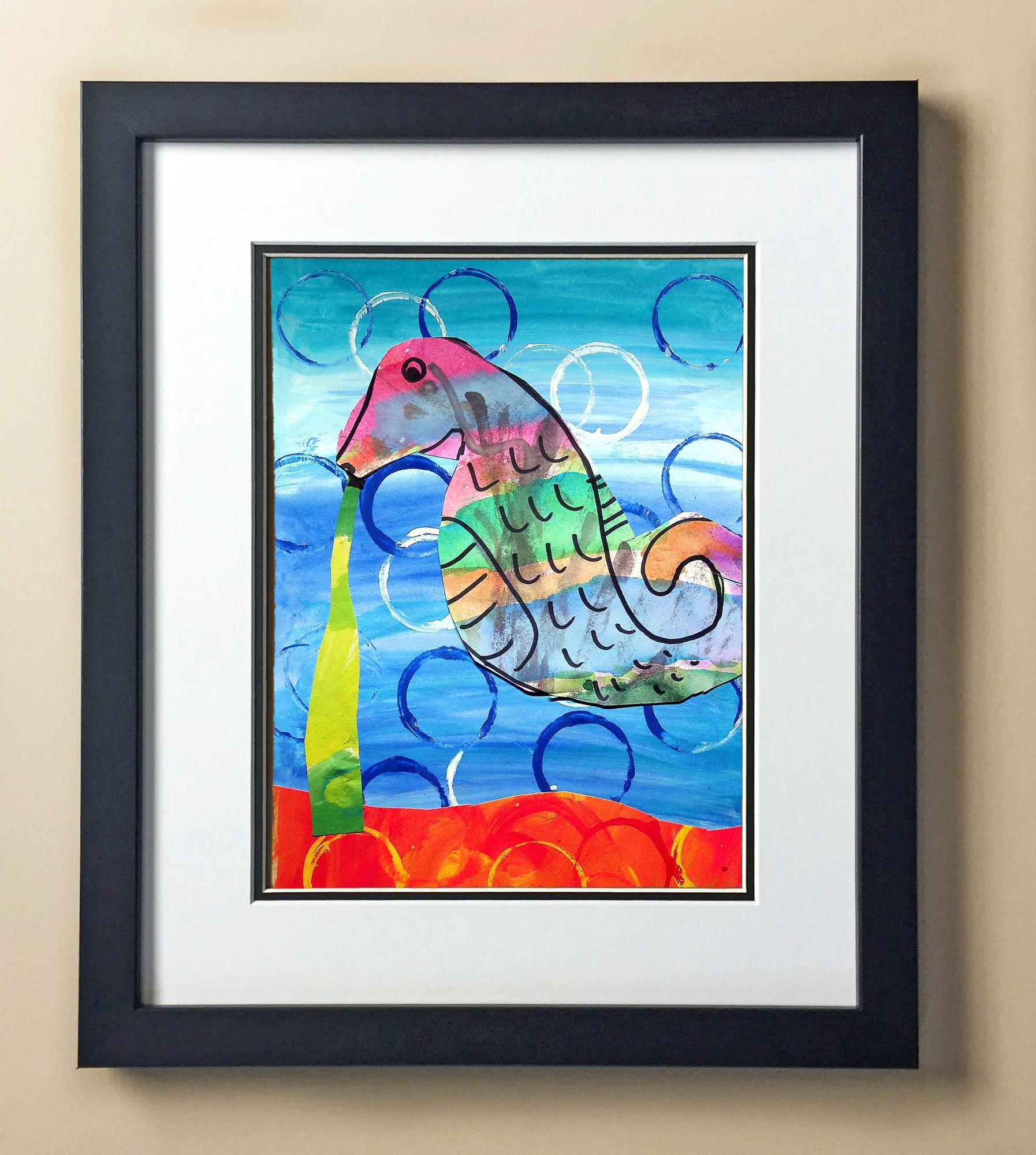 Included with the purchase is the Students Artwork, Frame, double matboard, shatter proof plexiglass, and a ready to hang backerboard with turnbuttons
