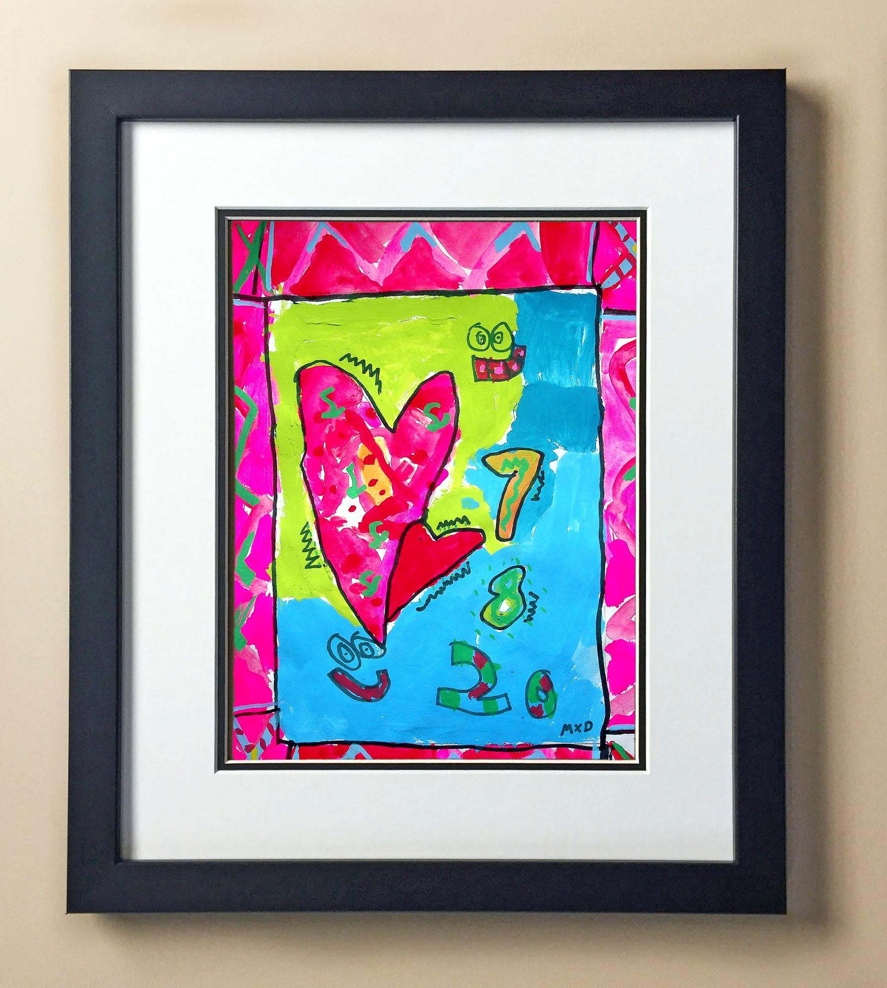 Included with the purchase is the Students Artwork, Frame, double matboard, shatter proof plexiglass, and a ready to hang backerboard with turnbuttons