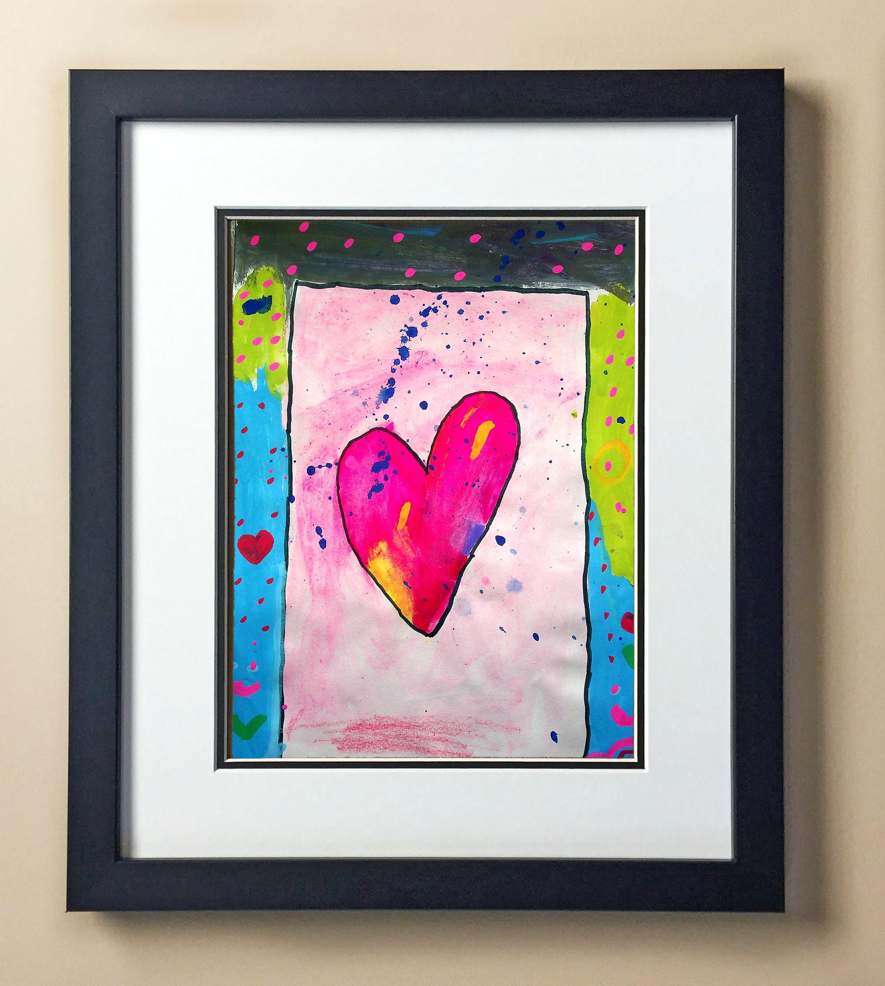 Included with the purchase is the Students Artwork, Frame, double matboard, shatter proof plexiglass, and a ready to hang backerboard with turnbuttons