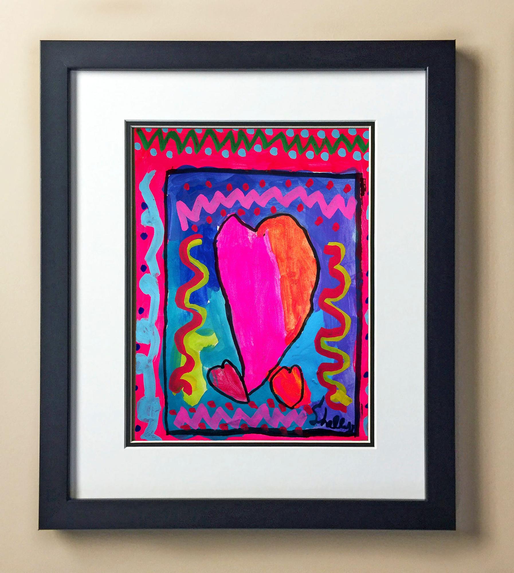 Included with the purchase is the Students Artwork, Frame, double matboard, shatter proof plexiglass, and a ready to hang backerboard with turnbuttons