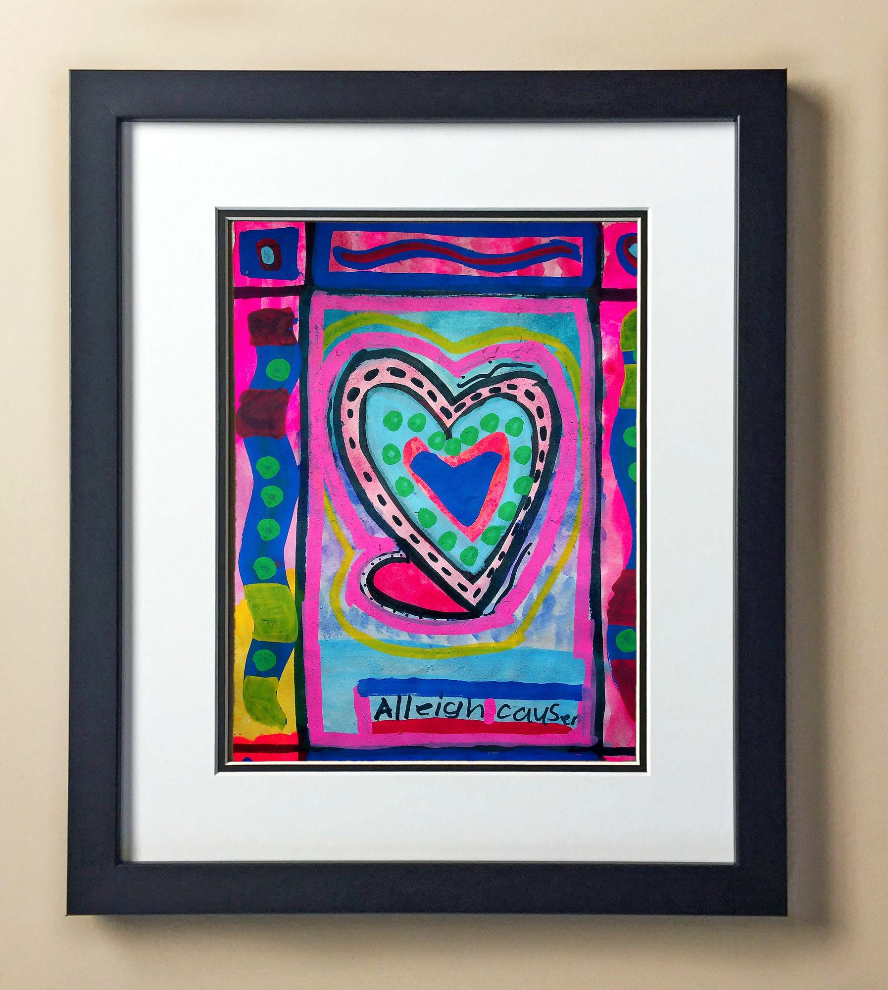 Included with the purchase is the Students Artwork, Frame, double matboard, shatter proof plexiglass, and a ready to hang backerboard with turnbuttons