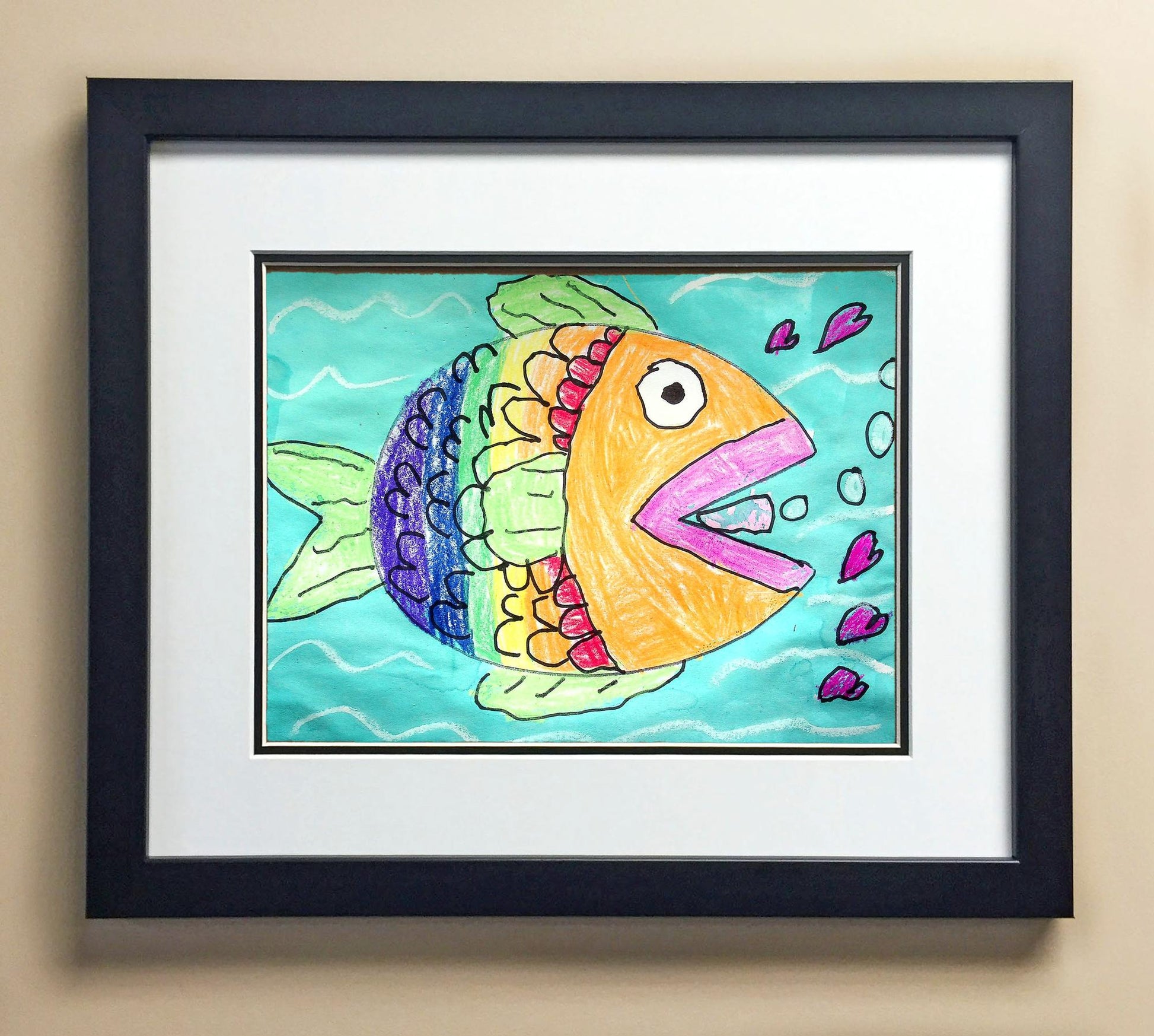 Included with the purchase is the Students Artwork, Frame, double matboard, shatter proof plexiglass, and a ready to hang backerboard with turnbuttons