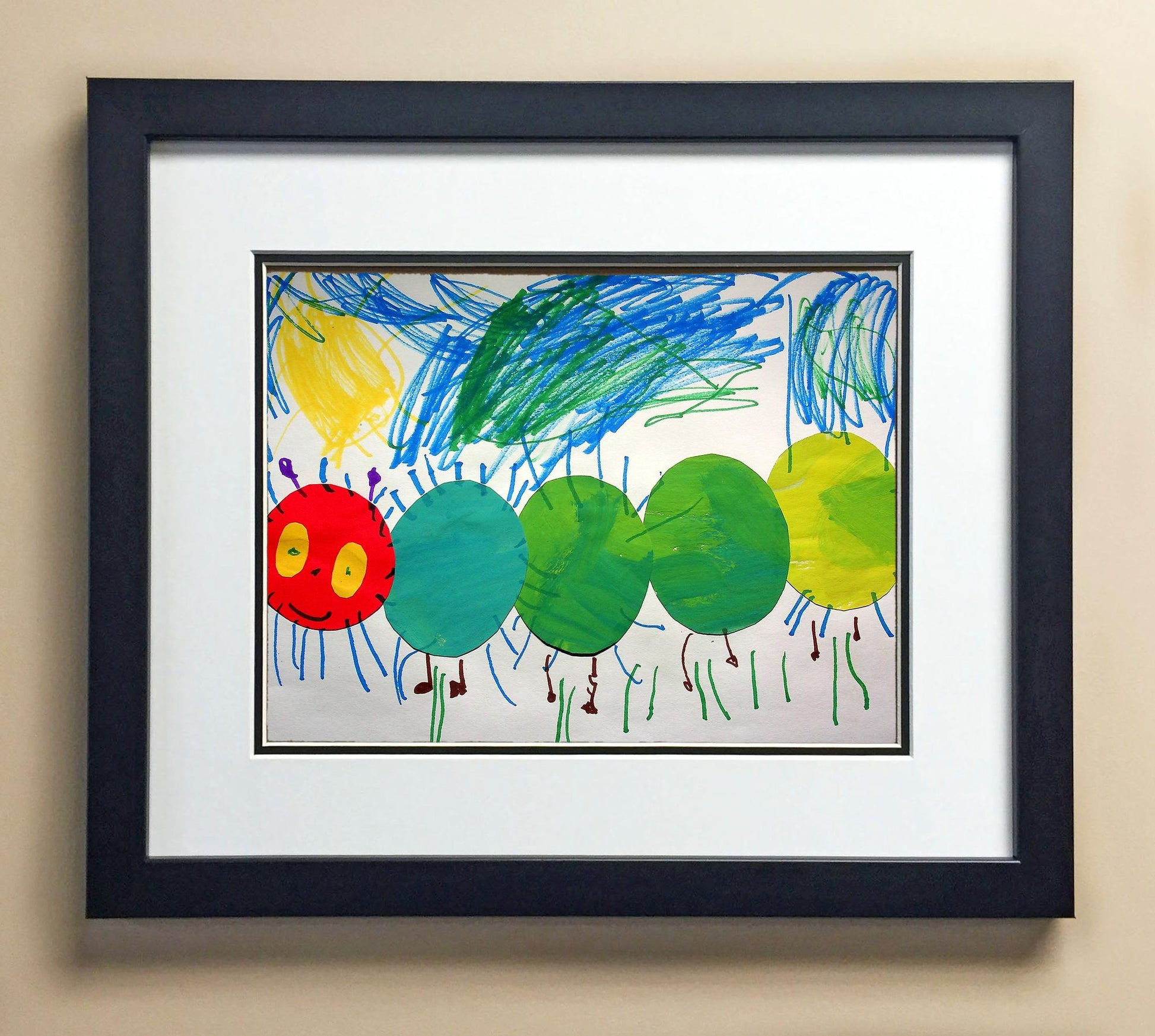 Included with the purchase is the Students Artwork, Frame, double matboard, shatter proof plexiglass, and a ready to hang backerboard with turnbuttons