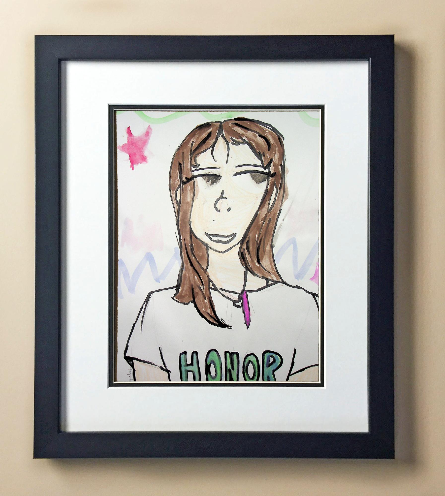 Included with the purchase is the Students Artwork, Frame, double matboard, shatter proof plexiglass, and a ready to hang backerboard with turnbuttons