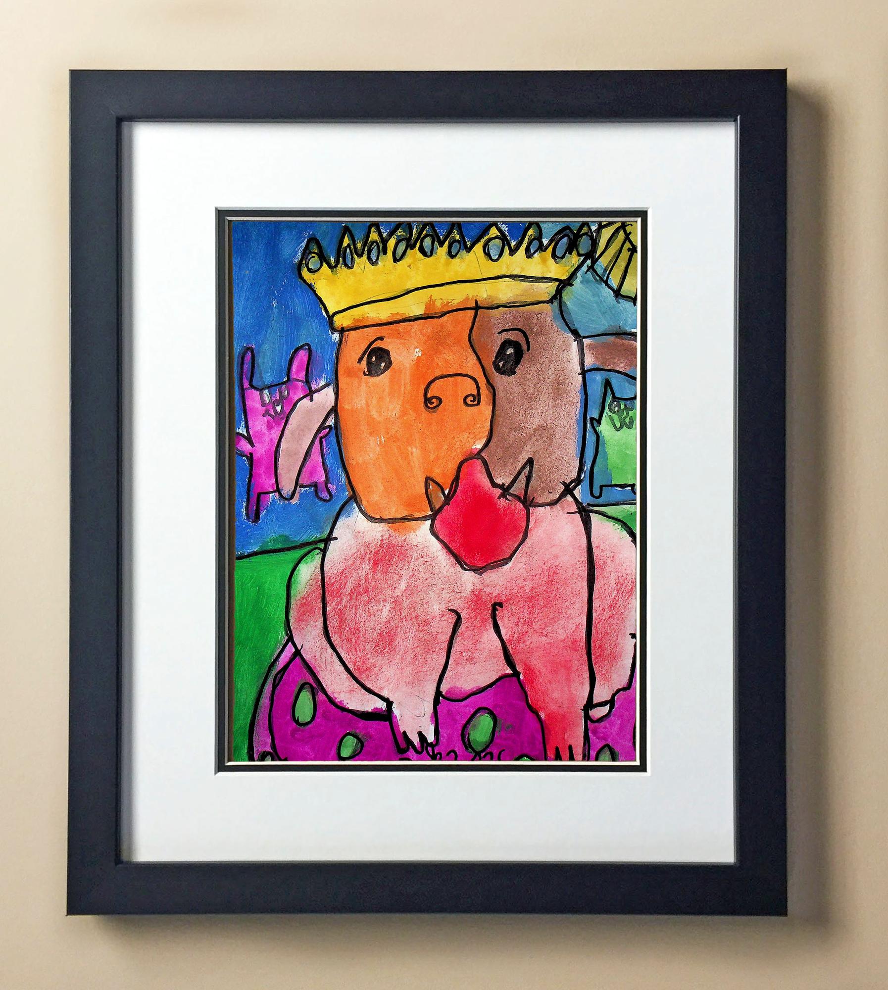 Included with the purchase is the Students Artwork, Frame, double matboard, shatter proof plexiglass, and a ready to hang backerboard with turnbuttons