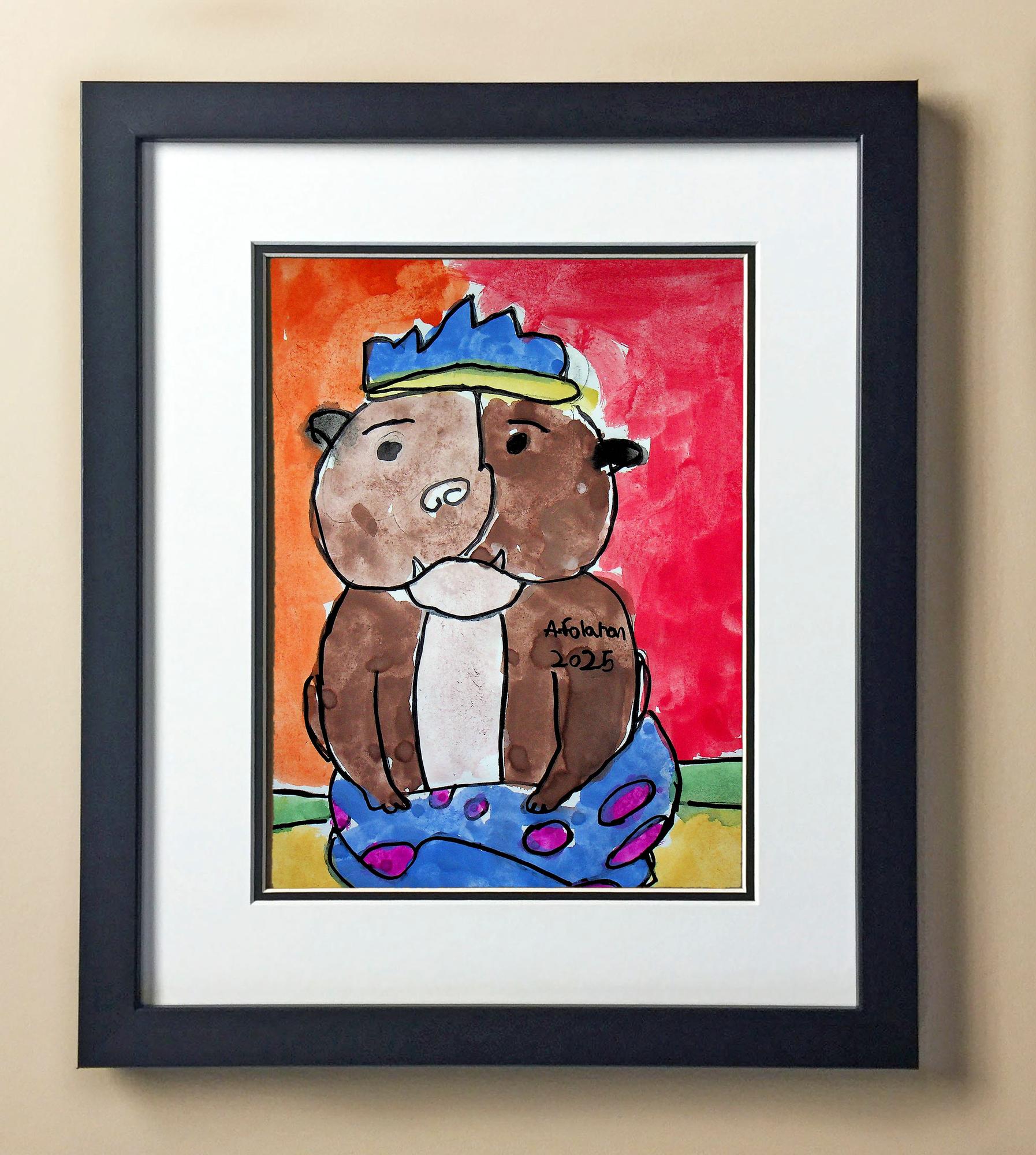Included with the purchase is the Students Artwork, Frame, double matboard, shatter proof plexiglass, and a ready to hang backerboard with turnbuttons