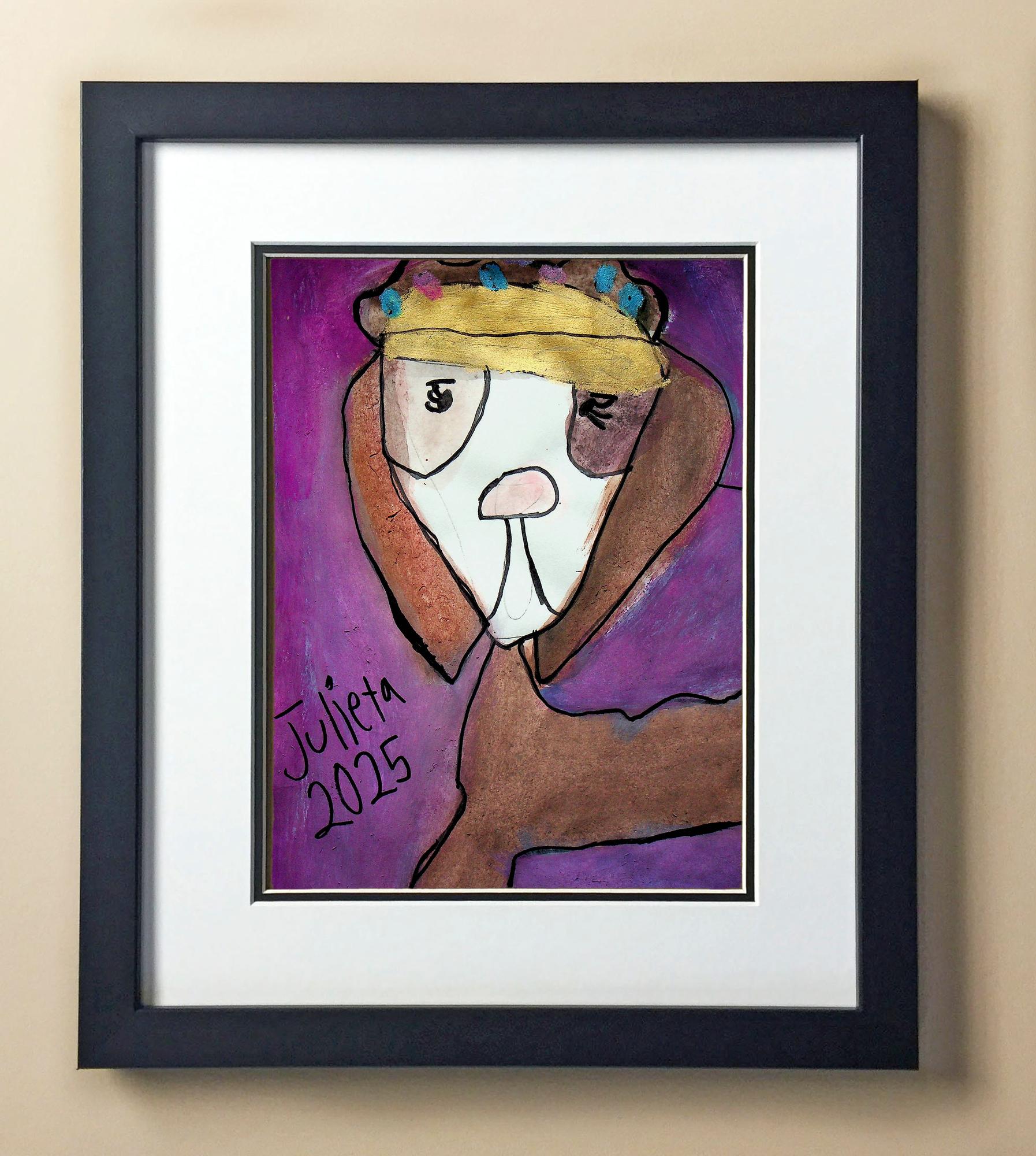Included with the purchase is the Students Artwork, Frame, double matboard, shatter proof plexiglass, and a ready to hang backerboard with turnbuttons