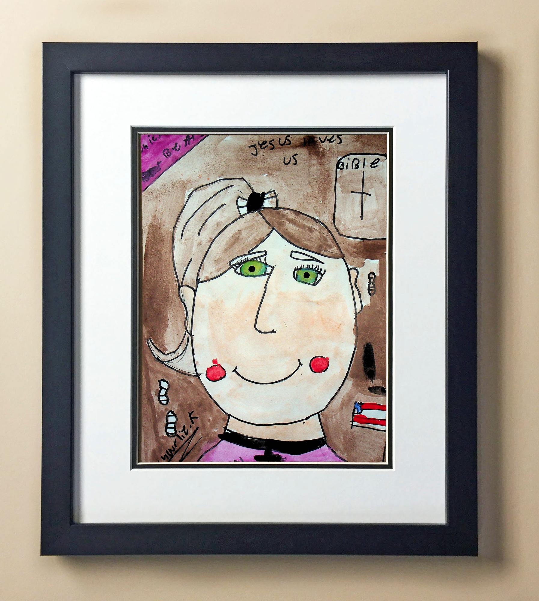 Included with the purchase is the Students Artwork, Frame, double matboard, shatter proof plexiglass, and a ready to hang backerboard with turnbuttons